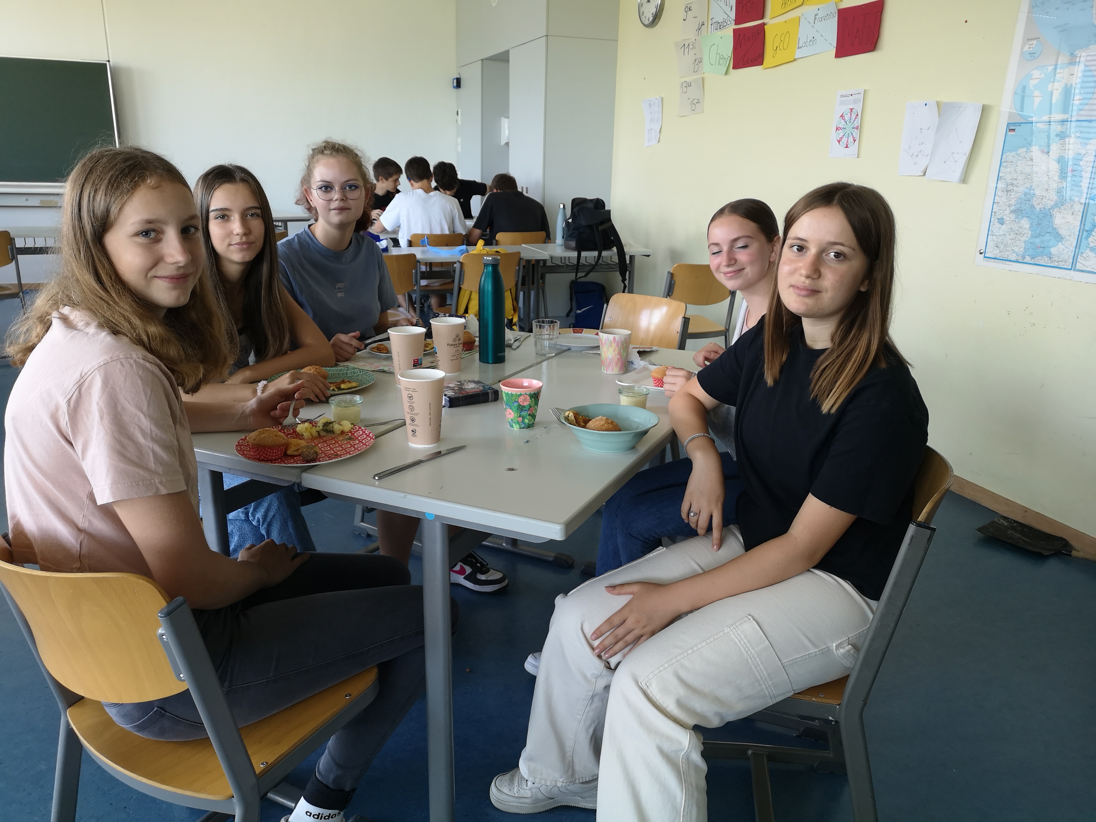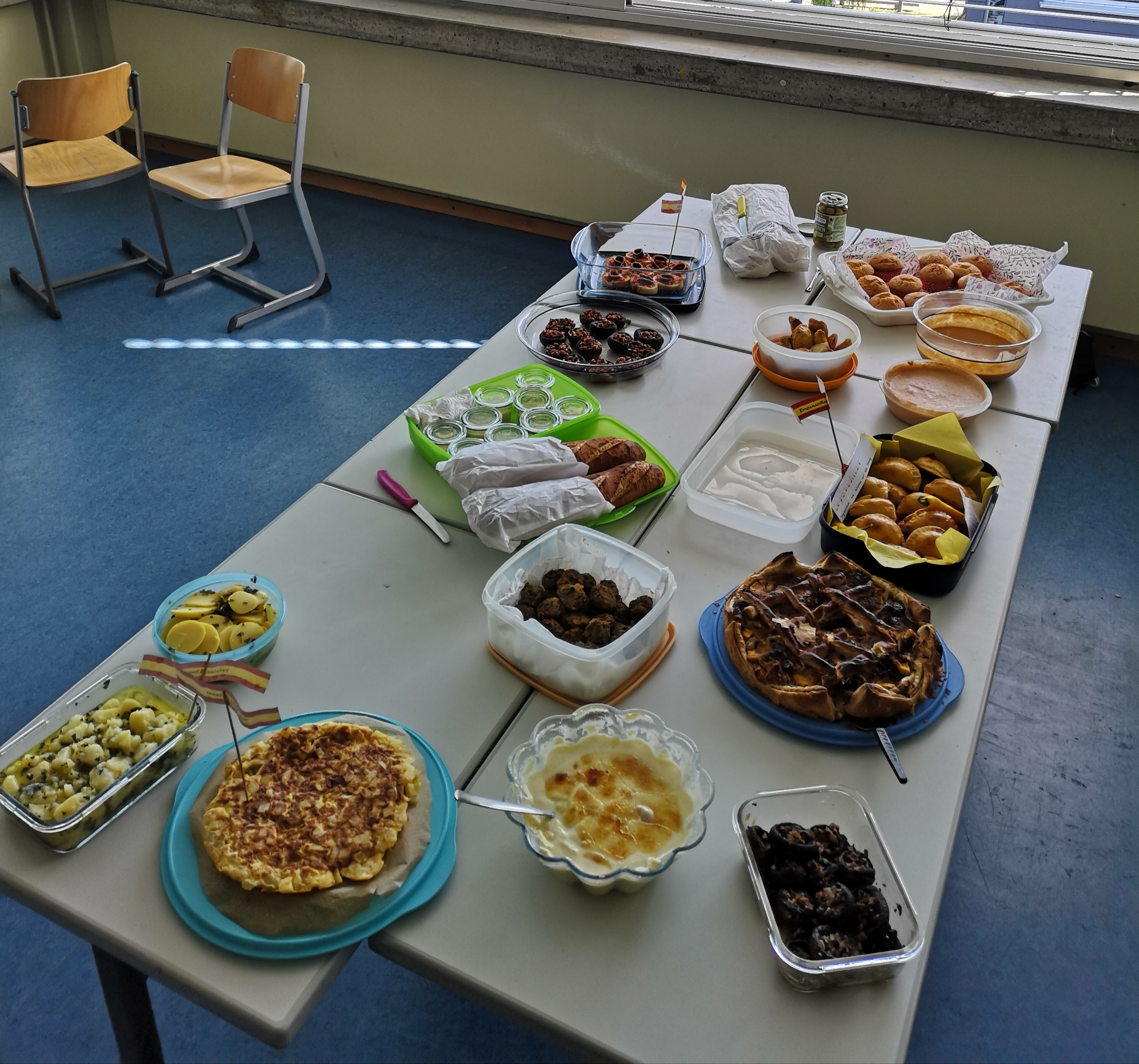 „Guten Appetit“ wünschten sich die Spanisch-Schülerinnen und -schüler der G08be, die für die letzten beiden Spanischstunden in diesem Schuljahr ein reichhaltiges Tapas-Buffet vorbereitet hatten. ¡Qué rico! Wie lecker und reichhaltig – da fehlte es an nichts! Albóndigas, croquetas, pan con tomate, aceitunas, empanadas, um nur ein paar Wenige zu nennen. Und eine alkoholfreie Sangría durfte natürlich auch nicht fehlen. Im Vorfeld erfuhren die Schülerinnen und Schüler im Unterricht einiges über Tapas, die Esskultur in den verschiedenen spanischen Regionen, den Einfluss des Klimas und warum die Essenszeiten im Vergleich zu Deutschland so unterschiedlich sind.