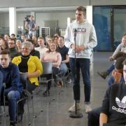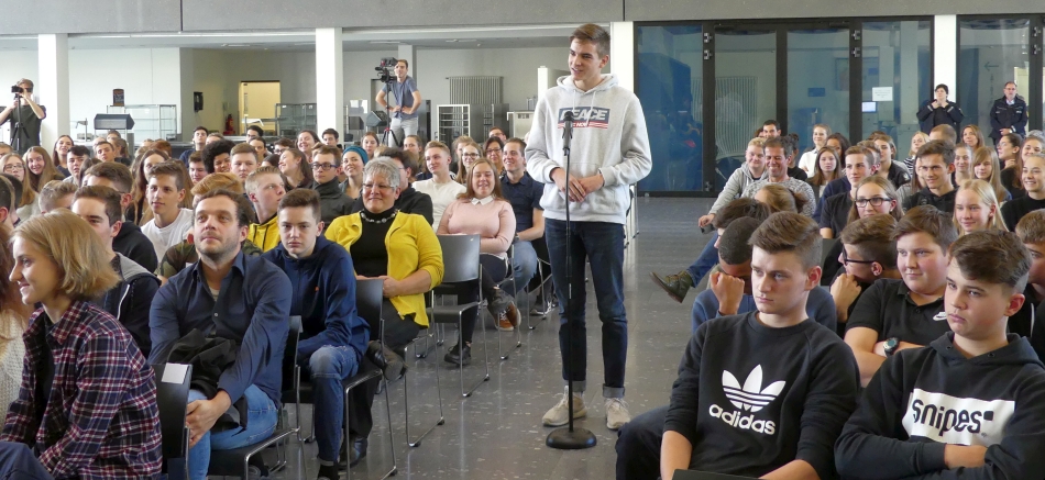 Frau Kunzweiler sprach Herrn Dr. Schäuble auf den Karlspreis für Verdienste im Rahmen der europäischen Einigung an und fragte, wie er die Entwicklung der Europäischen Union, vor allem den Brexit sehe. „Schmerzt ihr Herz ab und an bei dem Gedanken an diese Spaltung?“ Herr Dr. Schäuble antwortete nachdenklich: „Natürlich schmerzt mich das ab und zu, aber was will man machen? Die Entscheidung liegt bei den Ländern selbst. Ich persönlich bin der Meinung: Zukunft kann man nur gemeinsam gestalten. Wir müssen jeden Tag daran arbeiten, damit es besser wird.“ Nur sehr wenige junge Menschen in Großbritannien hätten an der Abstimmung über den Brexit teilgenommen, obwohl sie dagegen waren. Er appellierte an die Schülerinnen und Schüler: „Entscheidet mit, wenn ihr könnt. Kümmert euch, engagiert euch!“