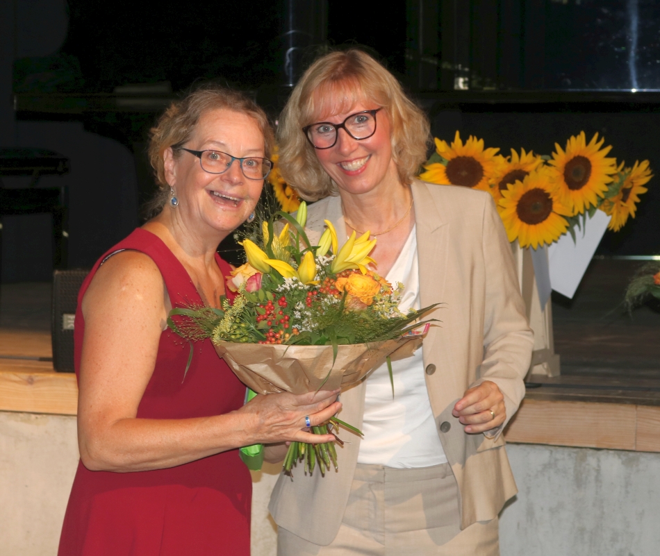 Musikalisch geprägt war – ganz selbstverständlich – auch die Verabschiedung von Andrea Frey-Melder. Nachdem sie selbst die Heimschule als Schülerin besucht hatte, war sie 36 Jahre als Referendarin und Lehrerin an der Realschule tätig. Für die Fachschaft Musik zeigte sich Christoph Breithack beeindruckt davon, wie es ihr gelungen sei, in ihrem Musikunterricht immer eine „positive, gelöste, musikalische Atmosphäre“ zu schaffen. Für das gesamte Kollegium beeindruckend war der Rückblick auf ihre Tätigkeit als Gründerin und Leiterin der Musical-AG. Per Videobotschaft meldeten sich aktuelle und ehemalige Schülerinnen und Schüler und berichteten, wie es Andrea Frey-Melder in den vergangenen 20 Jahren gelungen sei, junge Talente, darunter Helena Steiner, die heute Sängerin an der Stuttgarter Oper ist, zu entdecken und mit ihrer Begeisterung und Energie anzustecken.