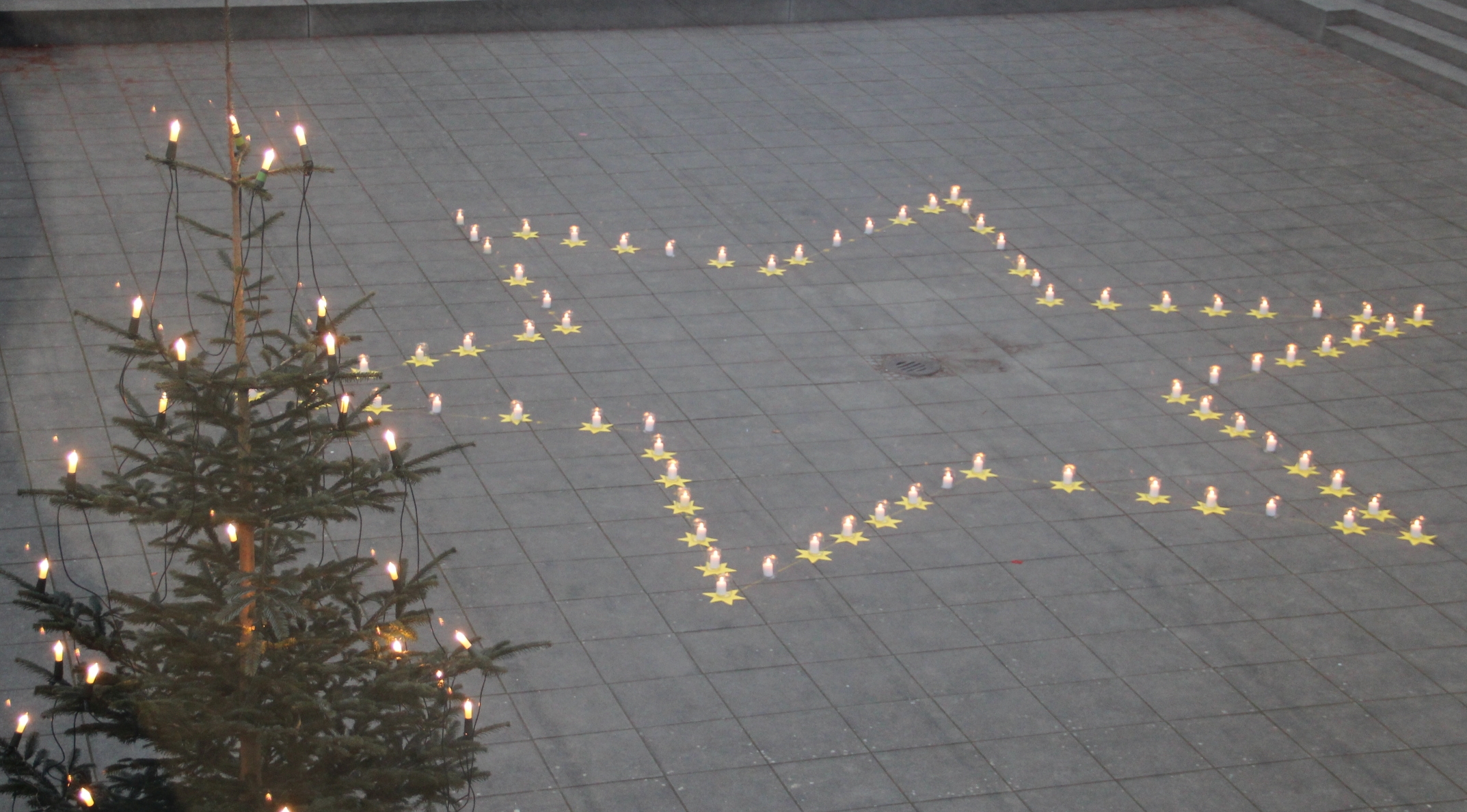 Zu Beginn der ersten Schulstunde wurde in jedes Klassenzimmer ein kurzer Impuls übertragen, den Schulseelsorgerin Sonja Rupp und die Fachschaft Religion gemeinsam vorbereitet hatten. Auf dem Weg, auf dem normalerweise organisatorische Durchsagen gemacht werden, erreichte alle Schülerinnen und Schüler die Zusage des Weihnachtsfestes: Gott kommt in die Welt – er bringt Licht in unser Dunkel. Symbolisch wurde in jeder Klasse eine Kerze entzündet, die dann zu einem großen Stern auf dem Schulhof zusammengetragen wurden. Ein Bild der Hoffnung und Verbundenheit.
