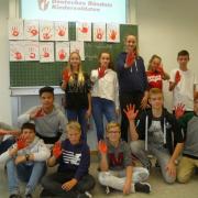 26 rote Hände mit viel Bedeutung: Während der Thementage der Realschule setzten die Schülerinnen und Schüler der 8. Klasse ein Zeichen gegen den Missbrauch von Kindern als Soldaten. Sie unterstützen damit die „Aktion Rote Hand“.