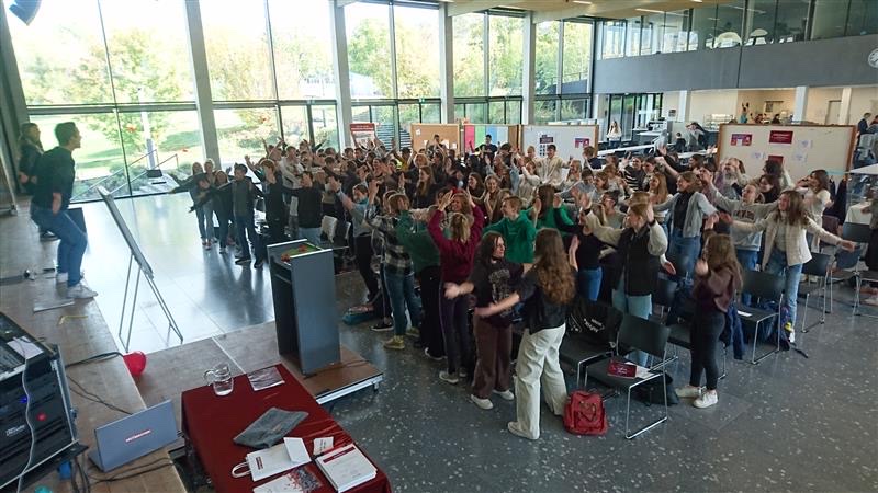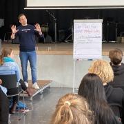 „Baue Selbstvertrauen auf! Das ist für mich der zentrale Punkt des Tages“, erklärt Pascal Keller den Teilnehmerinnen und Teilnehmern des Workshops und lädt sie damit dazu ein, sich über eigene Stärken Gedanken zu machen. Hier wird deutlich: Beim Angebot der „Mutmacher“ geht es in Sachen Berufsorientierung nicht ausschließlich darum, sich über die Möglichkeiten von Ausbildungen und Studiengängen zu informieren. Vielmehr steht im Mittelpunkt, sich zu überlegen, wie man zu eigenen – mutigen Entscheidungen – kommt. An der Heimschule konnten hierfür alle 9. und 10. Klassen des Gymnasiums je einen ganzen Vormittag erleben, an denen sie Vorträge hörten, in Partnerübungen oder für sich allein darüber nachdachten: Welche Ziele habe ich? Was sind meine Stärken? Was beeinflusst mich in meinen Entscheidungen? Die Schülerinnen und Schüler der 10. Klassen werden dies noch bei weiteren Workshops nach den Herbstferien vertiefen können. Ein weiterer Gast bei den Workshops war die Studien- und Berufsberaterin Karina Kokemüller (Agentur für Arbeit Offenburg), die sich den Schülerinnen und Schülern vorstellte und somit auf die Tür für dieses Beratungsangebot zur Zukunftsplanung öffnete.