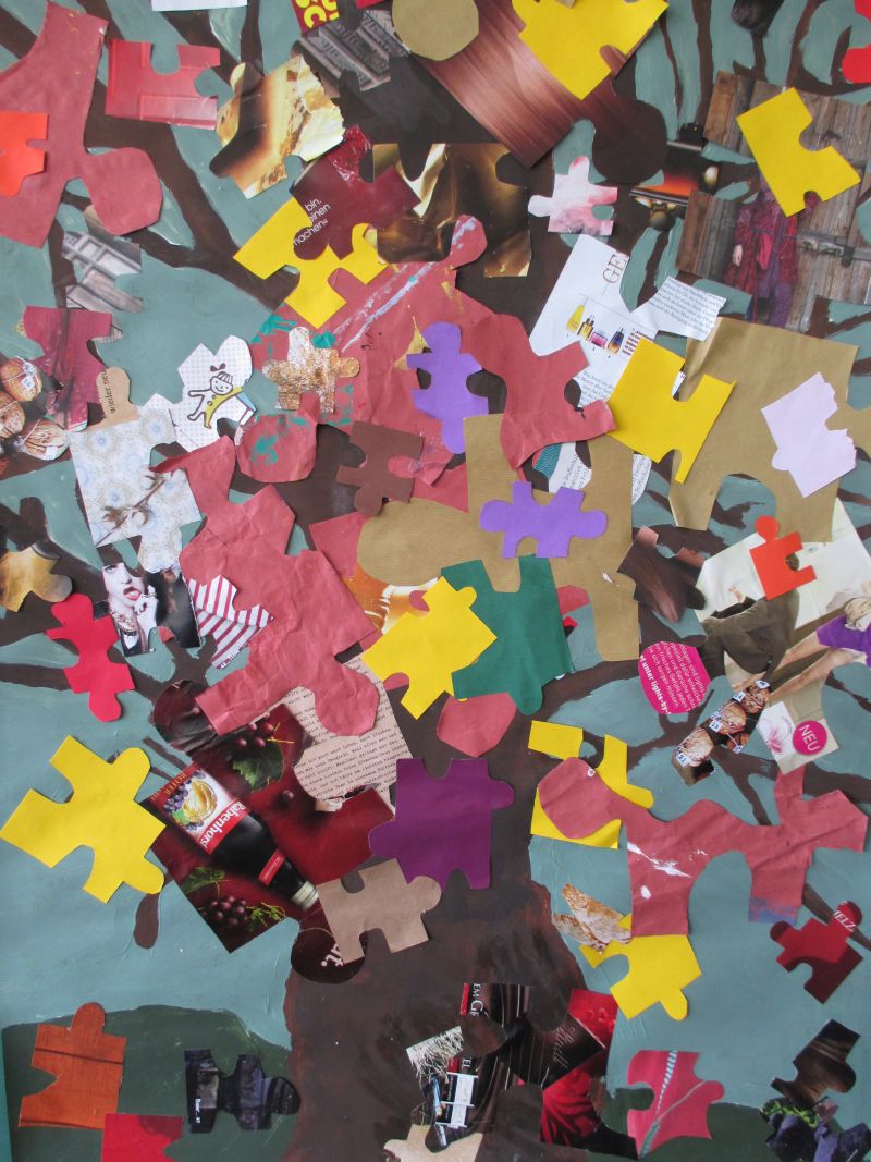 Angeregt durch die Jahreszeitenbäume von Frau Krappitz, gestaltete die Klasse eigene Umsetzungen des Themas in größeren Gruppen, wobei zur Jahreszeit passende Acrylfarben jeweils für den Baumstamm und den Untergrund ausgewählt wurden und Collageelemente aus verschiedensten Papieren anstelle von Blättern die Baumkrone bilden. In den Originalbildern sind anstelle der Blätter Kreisformen zu sehen, bei unserer Umsetzung prangen Ovale, Buchstaben und Zahlen, Puzzleteilchen und Eiskristalle an den Bäumen.