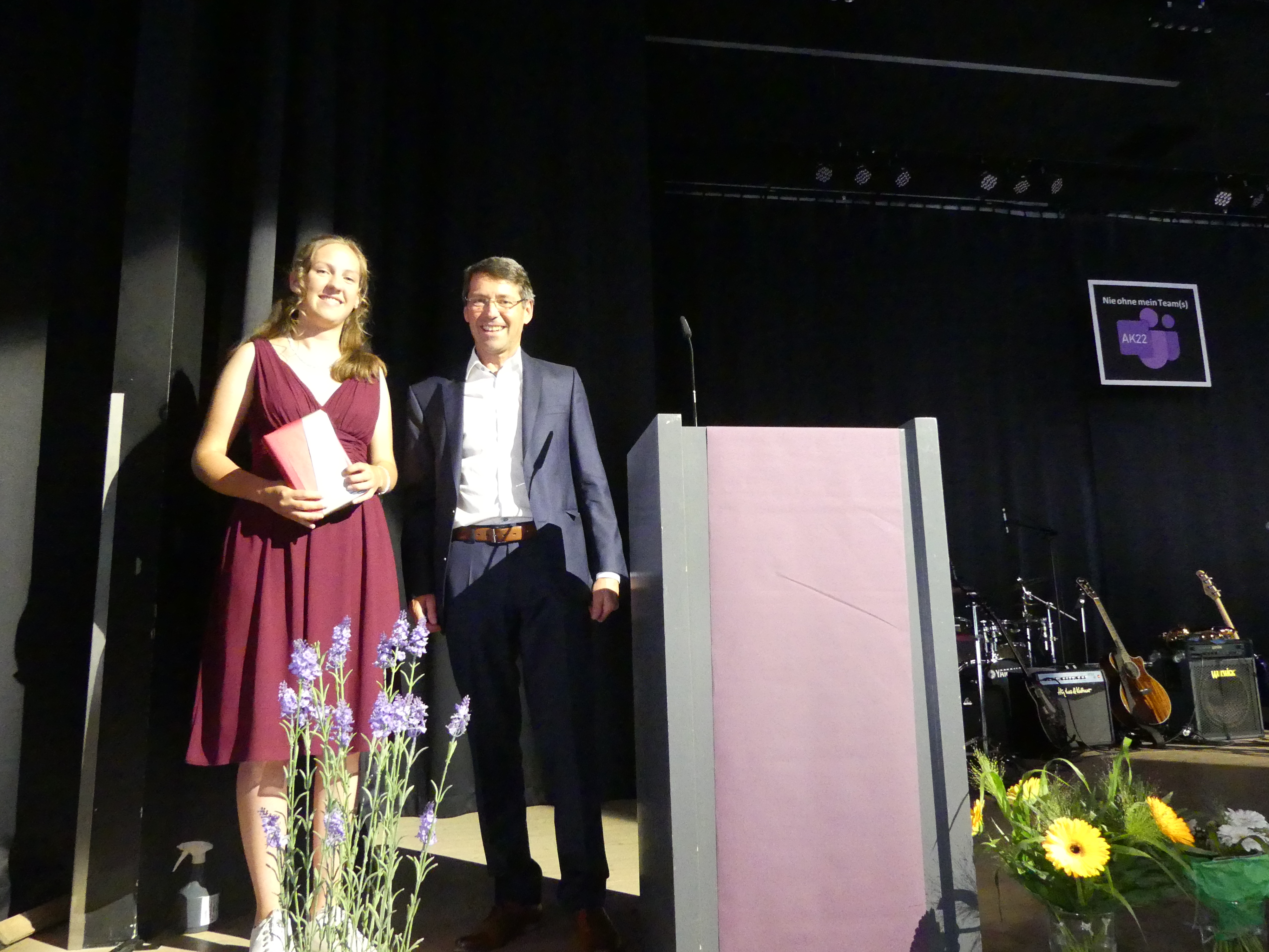 Besonders stabil waren die Noten von Franziska Maurer. Mit einem Durchschnitt von 1,0 war sie herausragende Jahrgangsbeste. Bürgermeister Bruno Metz ließ es sich nicht nehmen ihr den Preis der Stadt Ettenheim zu verleihen. In seiner Ansprache sprach er über das Glück in einer Zeit den Realschlussabschluss zu machen, in der händeringend in fast allen Brachen nach Auszubildenden gesucht wird und auch das Glück in Wohlstand und Sicherheit zu leben. In Zeiten von Krieg und Unsicherheit sei es wichtig in Richtung Zukunft zu denken. Hier war Herrn Metz das Thema Nachhaltigkeit ein Anliegen. In diesem Bereich sieht Herr Metz die Schule auf dem richtigen Weg und ermutigte die Absolventinnen und Absolventen für eine positive Zukunft mit anzupacken.