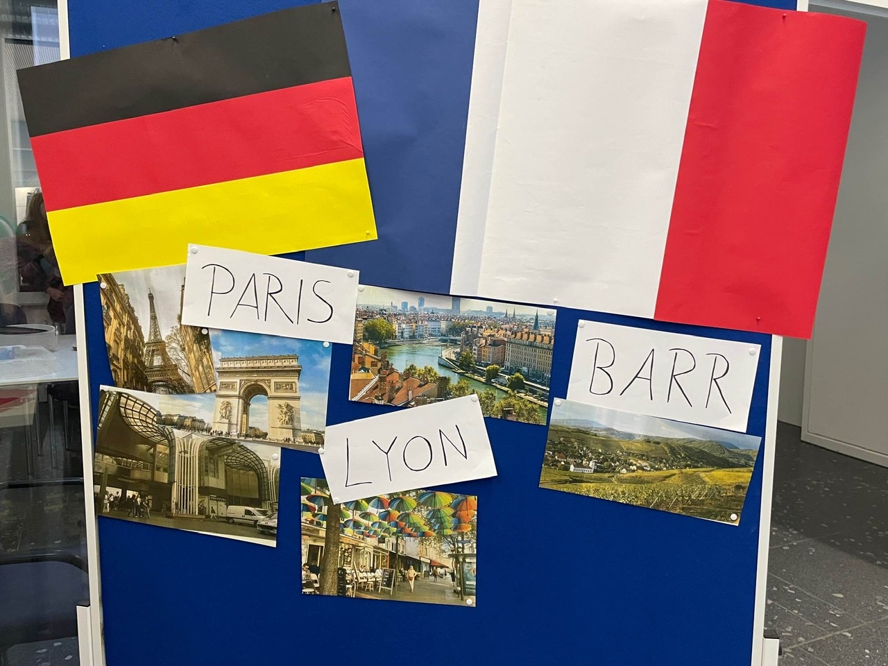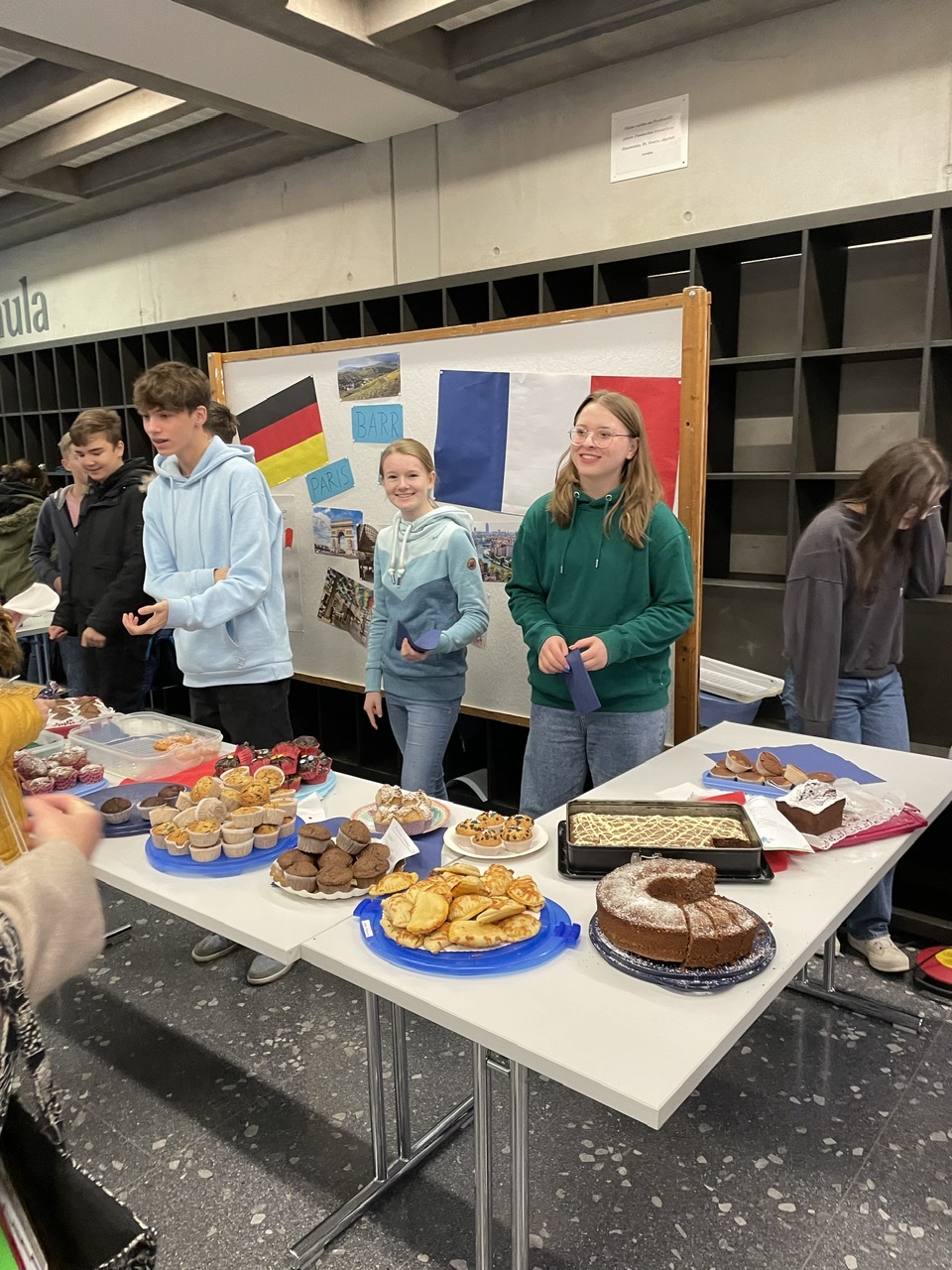 „Vive la Freundschaft!“ war für einen Tag das Motto an der Schule. Französische und deutsche Flaggen schmückten das Schulhaus – wer wollte, konnte sich auch in den Nationalfarben schminken lassen. In den Pausen wurde bei leckeren Kuchen und Muffins die deutsch-französische Freundschaft gefeiert. Der Erlös aus dem Verkauf der Leckereien kommt dem Sozialfond der Schule zugute, mit dem u.a. die internationalen Austausche unterstützt werden.
