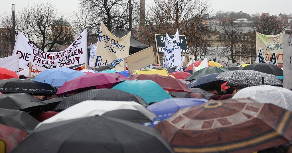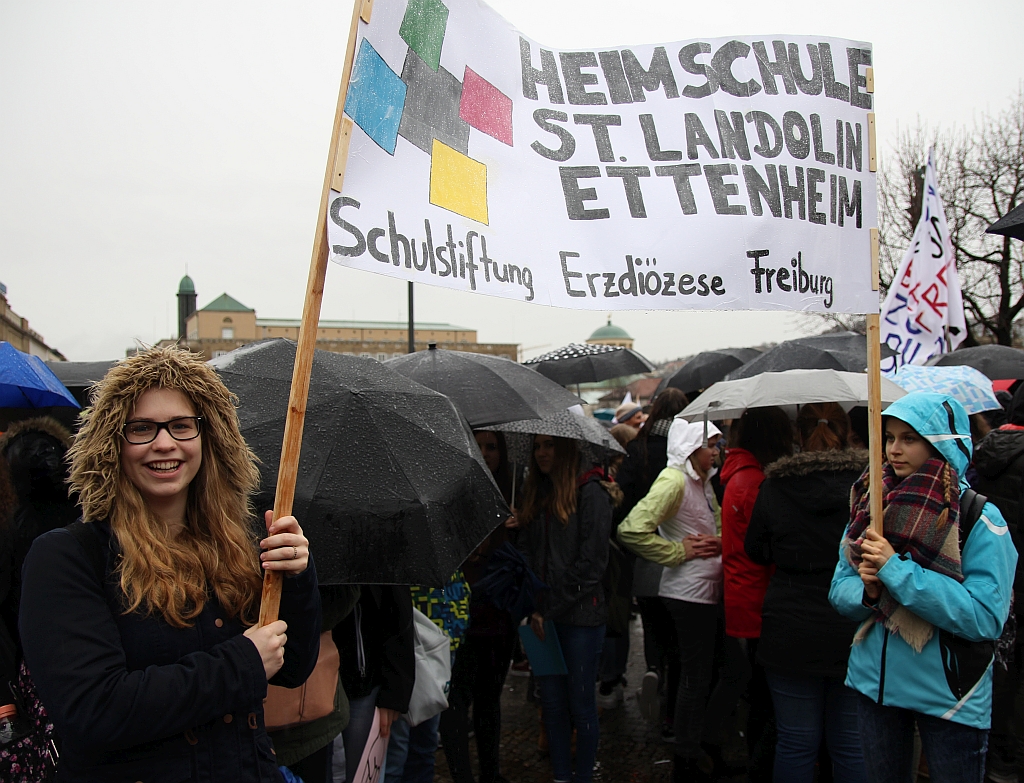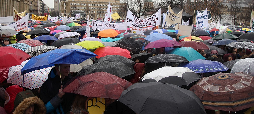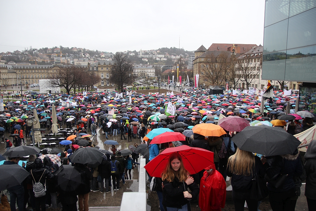 Darüber hinaus haben sich über 50 Schülerinnen und Schüler aus der Klasse 10d und aus der S12a gemeinsam mit den Lehrern Reiner Winterhalder und Yvonne Sieber sowie mit Gesamtleiter Eberhard Pfister auf den Weg nach Stuttgart gemacht. Trotz des Dauerregen konnten die Schülerinnen und Schüler beeindruckende Erfahrungen in Sachen politischer Meinungsbildung und Partizipation machen – nicht nur im Rahmen der Kundgebung selbst, sondern auch in spannenden Diskussionen mit Passanten am Rande der Veranstaltung.