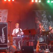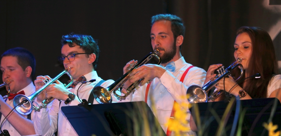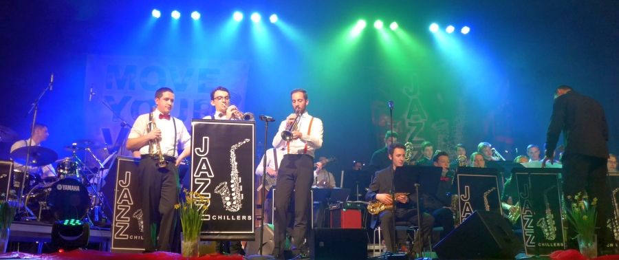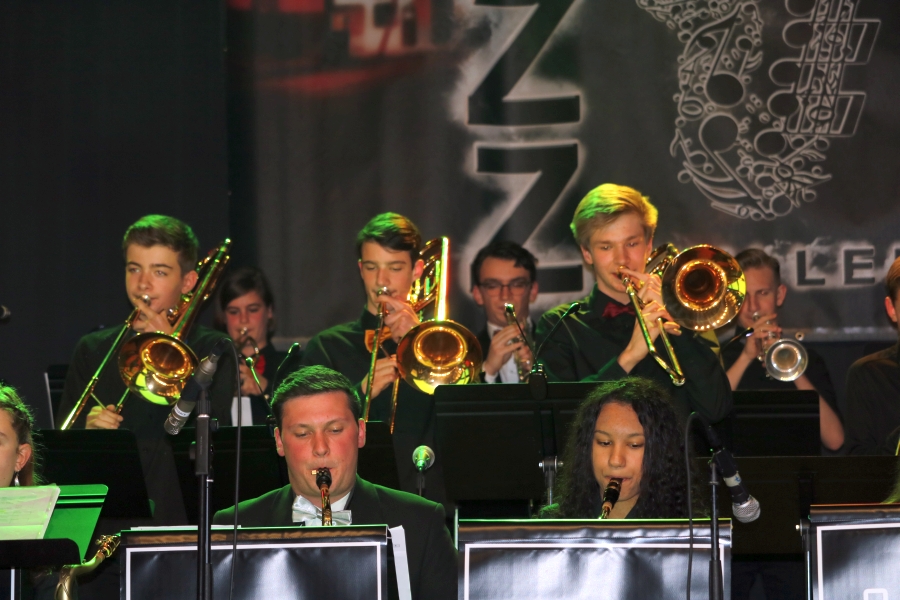 Big Bands an der Heimschule haben Tradition, die erste wurde bereits 1982 ins Leben gerufen. Seit 2003 heißt die Big Band der Schule „Jazz Chillers“, sie wurde von Christoph Breithack gegründet. Ganz besonders schwungvoll eröffnete diese Band das Konzert mit dem Stück „Play That Funky Music“. Die Musik kam hierbei nicht nur von der Bühne, sondern auch aus dem Zuschauerraum. Die beiden hervorragenden Solisten Lukas Andlauer (Trompete) und Cedric Lin (Saxophon) bewegten sich auf ihren Instrumenten spielend durch das Publikum, um sich auf der Bühne mit den anderen Musikern zur Big Band zu vereinigen. Die Zuhörer konnten in der vollbesetzten Aula bei „Switch in Time“ wirklich den Schalter umlegen, den Alltag vergessen und sich von der teils lässigen, teils sehr lebendigen Musik entführen lassen: mit „Moondance“ zu einem romantischen Spaziergang im Mondschein oder bei „Crazy Little Thing“ zu einem mitreißenden Rock`n Roll. Als Gesangssolist begegnete das Publikum hier dem ehemaligen Jazz Chiller Ruben Kilchling. Auch der Pariser Metro wurde mit „Straßbourg St. Denis“ ein Besuch abgestattet und man traf wieder auf die beiden Solisten Lukas Andlauer und Cedric Lin. Als weitere Solisten glänzten Mika Stelter (Posaune), Angel Saumer (Trompete) und Hannah Kollmar (Saxophon).