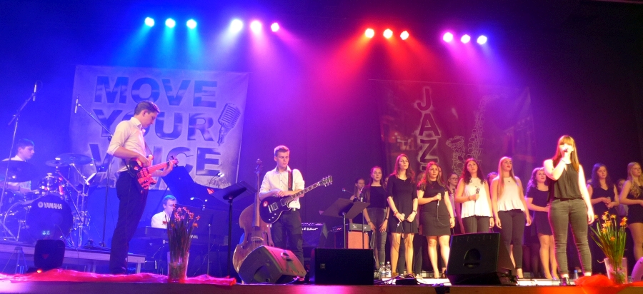 Auch der Chor „Move Your Voice“ ist mittlerweile eine fest etablierte Größe in der musikalischen Landschaft der Heimschule. Immer wieder gehen aus diesem Chor kleine Gesangssternchen hervor mit sehr schönen, zum Teil schon sehr ausgereiften Stimmen. Bekannte und beliebte Hits hatte man sich für dieses Konzert ausgesucht. Vom sehr gefühlvollen „Read all about it“ über den aktuellen Hit „Budapest“ bis hin zu dem Musicalsong „What a feeling“ reichte die Bandbreite.