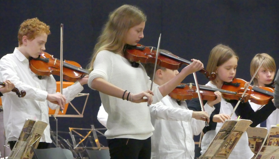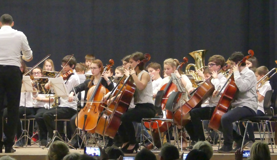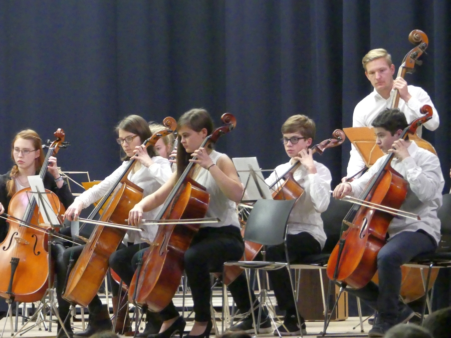 Eröffnet wurde das Konzert von der 7. Klasse, die ihr Debüt im Kreis der fortgeschrittenen Orchester der Schule hatte. Die 8. und 9. Klassen boten ein vielseitiges Programm von Klassik bis Jazz, teils in einem zusammengesetzten großen Orchester, teils im Klassenorchester. Immer wieder kamen die amerikanischen Dirigenten auf die Bühne, um einzelne Stücke mit den Orchestern aufzuführen. Aber auch unter der Stabführung ihrer Musiklehrer Christoph Breithack und Tobias Schulz zeigten die Klassen präzises und musikalisches Spiel, was von den 470 Konzertbesuchern mit reichlich Beifall belohnt wurde. Nach einem gemeinsamen Stück der 9. und 10. Klassen bildete der Konzertteil der 10. Klasse den Abschluss des Konzerts.