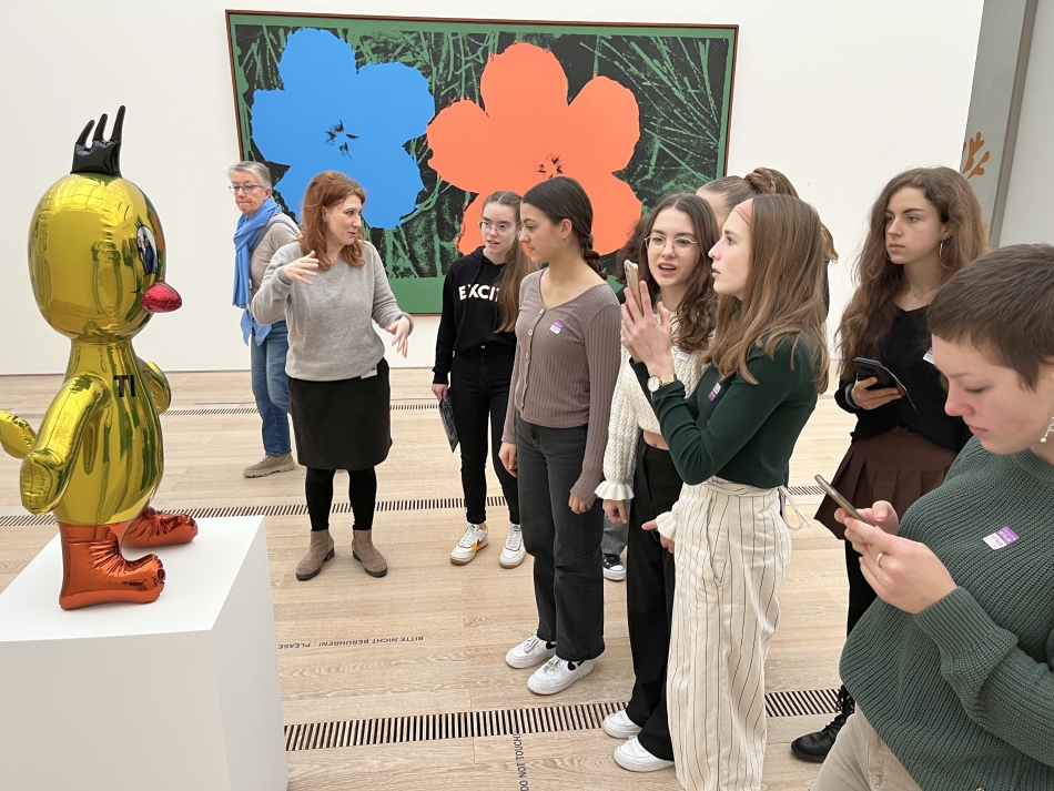 Monets riesengroßes dreiteiliges Seerosenbild, Klees Farbfeldmalerei, Giacomettis ausgezehrte Figuren, Picassos reiches Werk im Überblick, Warhol und Lichtenstein als Vertreter der Pop Art, Scherenschnitte von Matisse, nicht leicht zugängliche Bilder von Francis Bacon und nicht zuletzt ein raumfüllendes begehbares Kunstwerk von Doris Salcedo, das an die ertrunkenen Migranten im Mittelmeer erinnert – all das wurde uns in einer spannenden Führung näher gebracht und hat großen Eindruck auf uns gemacht und uns manchmal auch tief berührt. Das Sammlerehepaar Beyeler legt großen Wert auf die Kunstvermittlung gerade an jüngere Besucher und darum konnten wir die Führung sowie einen anschließenden praktischen Workshop kostenfrei buchen und sind sehr dankbar für diese großzügige Aktion, die wir gerne wiederholen.