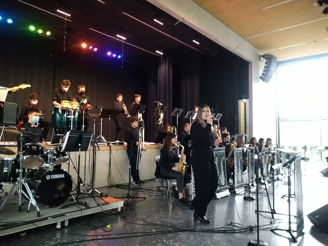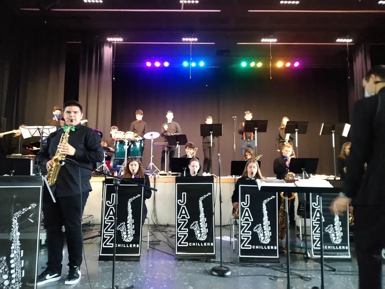 Die Jazzchillers unter der Leitung von Markus Albu begeisterten das große Publikum am Donnerstag mit abwechslungsreichen und anspruchsvollen Stücken wie Megalovania, Respect, Uptown Funk, Sing Sing Sing, Skyfall und Funkytown. Die Solistinnen und Solisten Levin Müller (R08a), Katrin Otto (R09c), Julia Kollmer (R09c), Luka Holtzmann (WG12), Adriano Weis (R09e), Felix Breithaupt (R10b) und Vanessa Müller (SG11) zeigten mit großem Elan, was in ihnen steckt, und die riesige Freude, endlich wieder vor so großem Publikum spielen zu dürfen.