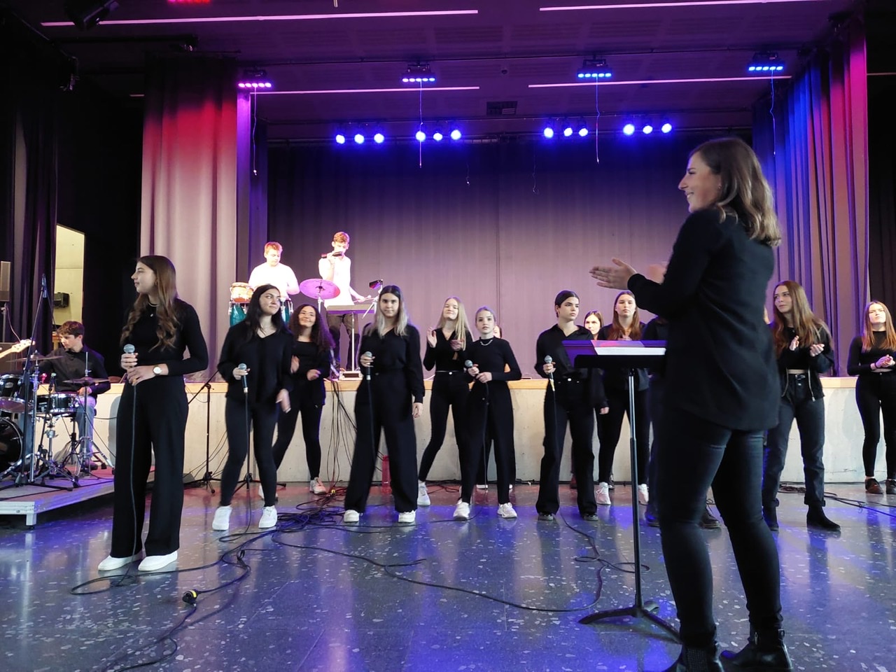 Auch am Freitag war die Vorfreude groß und das Publikum noch mehr gewachsen. Der Chor Move-Your-Voice mit Band unter der Leitung von Hannah Edelmann und Tobias Schulz brachte mit Stücken wie Rolling in the deep, Shake it off, Good 4 U, Shake it out, Shine, Head above water und Mamma Mia die Aula zum Klingen und Mitklatschen. Die Solistinnen Delia Dikop (R10b), Manon Kölblin (J1), Mara Klein (R08b), Ekaterini Kalograna (SG11a), Lea Gehrlein (R10a), Vanessa Müller (SG11), Jessica Cwik (J1) und Eva Kölblin (G07a) bescherten dem Publikum mit ihren energie- und emotionsgeladenen Stimmen die ein oder andere Gänsehaut!
