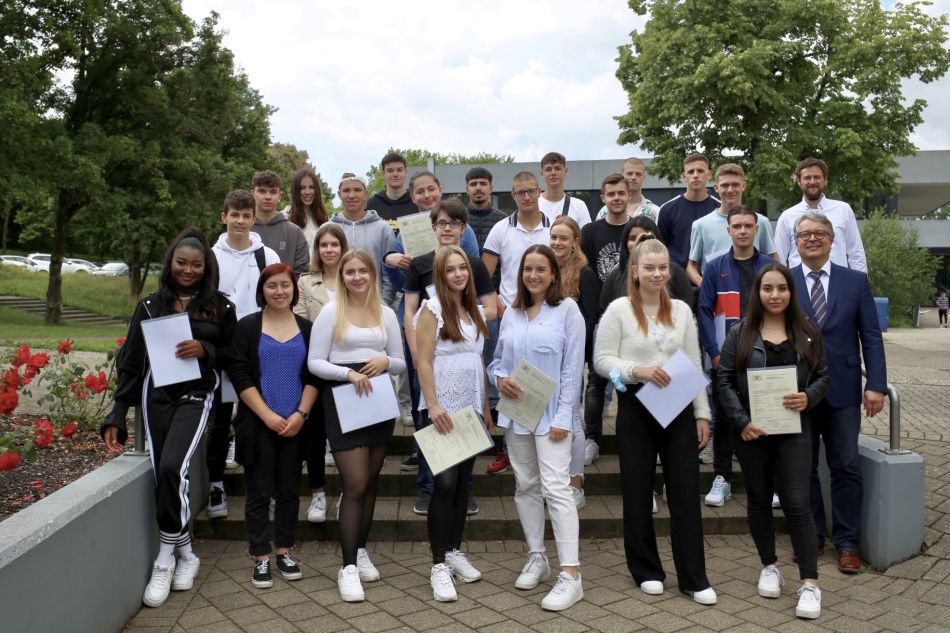 Mit Gratulationen und den besten Wünschen für den weiteren Ausbildungs- und Lebensweg haben Schulleitung und Lehrkräfte die Absolventinnen und Absolventen des Jahrgangs am Kaufmännischen Berufskolleg I der Heimschule St. Landolin verabschiedet. Magdalena Eichhorn erhielt für die besten Leistungen einen Preis. Außerdem wurden Yannik Marko und Abdullah Yildiz für besondere Leistungen ausgezeichnet. In einer kleinen Feierstunde überreichte Schulleiter Eberhard Pfister Preise und Zeugnisse.