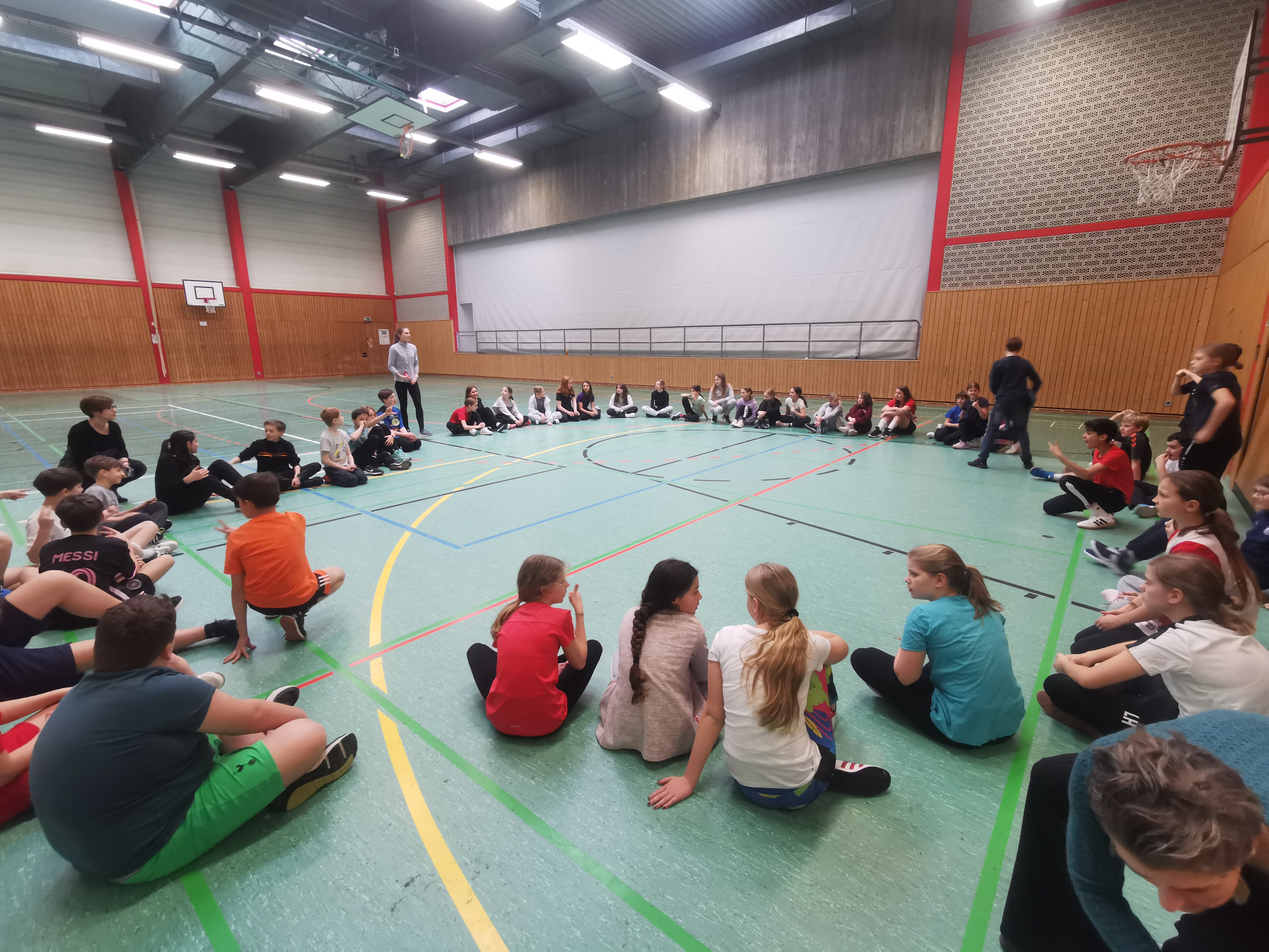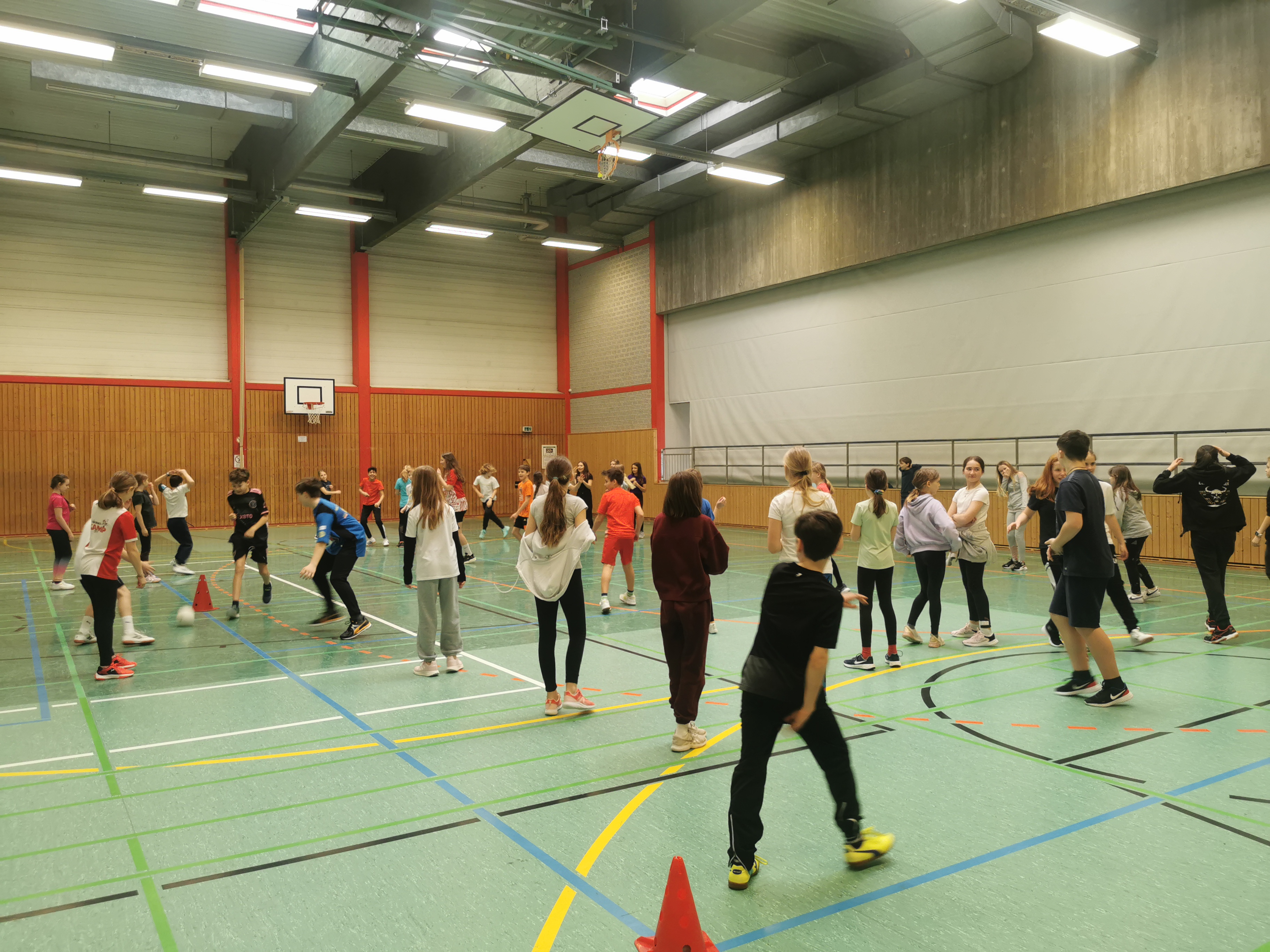 Die G6a berichtet über ihren Französisch-Austausch: Wir freuten uns schon alle sehr auf unsere Austauschpartnerinnen und -partner. Und am Montag, dem 18.3.2024, war es dann endlich so weit: Morgens haben wir das Klassenzimmer geschmückt und danach unsere französischen Austauschülerinnen und -schüler mit Plakaten und einem Lied empfangen. Nach der Begrüßung gab es ein Büffet und Spiele, die wir miteinander spielen konnten. Am Büffet gab es typisch deutsche Köstlichkeiten, die wir alle selbst mitgebracht hatten. Die Spiele waren dazu da unsere Austauschfreunde gegenseitig besser kennen zu lernen, uns miteinander zu verständigen und neue Wörter zu entdecken. Nachdem alle satt waren, sind wir zusammen zur Sporthalle gelaufen, um am geplanten Sportprojekt teilzunehmen, das Frau Ehrat geleitet hat. Dort haben wir verschiedene Arten von Völkerball gespielt, die uns allen sehr viel Spaß gemacht haben. Als der Gong zum Schulende geläutet hat, sind alle fröhlich mit den Austauschpartnern heimgegangen.