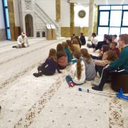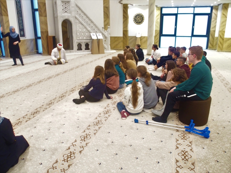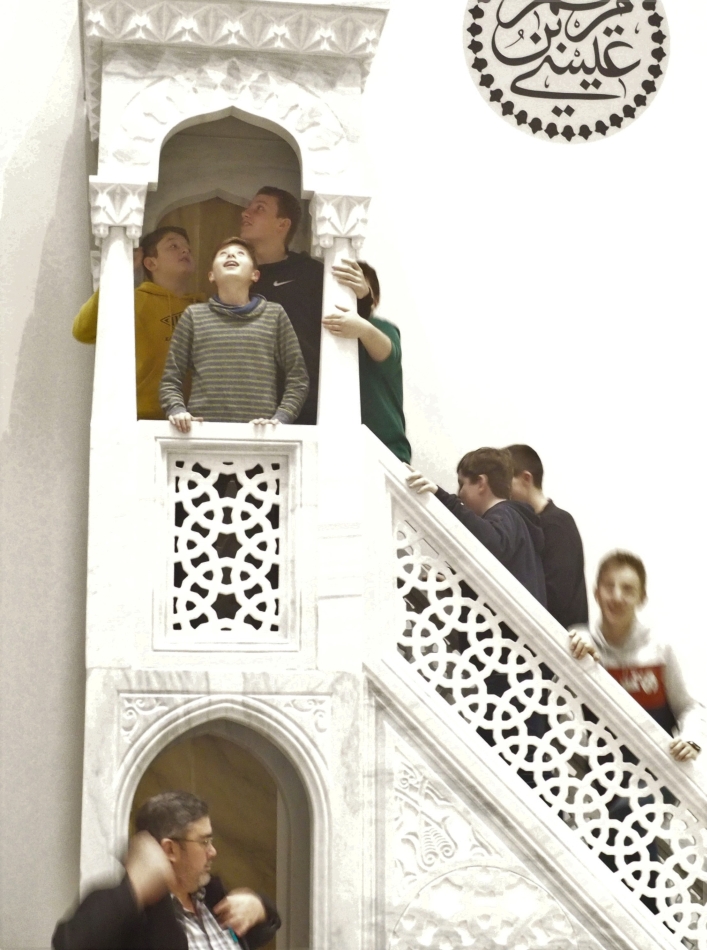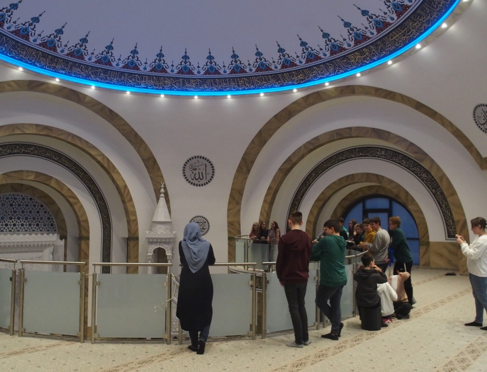 Die zweite Exkursion führte die Klasse gemeinsam mit Herrn Giesel nach Lahr. Mit dem Zug ging es von Orschweier nach Lahr und dann zu Fuß zur nahegelegenen neuen Moschee. Allein schon von außen ein beeindruckendes Gebäude! Unsere Gastgeberin Frau Gürbüz begrüßte uns und führte uns zuerst in den Gebetsraum, vor dessen Betreten alle zuerst ihre Schuhe ausziehen mussten. Nachdem die Schülerinnen und Schüler viele Informationen über das Gebäude und das Gemeindeleben erzählt bekamen, erlebte die Klasse sogar einen echten Gebetsruf, der von Imam Hüseyin Çınar vorgesungen wurde. Alle konnten dann noch viele Bilder des eindrucksvollen Raums fotografieren und auch die Minbar (Gebetskanzel) erklimmen. Nachdem die Klasse jede Menge Fragen stellen durfte, besuchten wir noch die Empore unter der Kuppel, die allein durch ihre Akustik schon ein echtes Highlight ist.