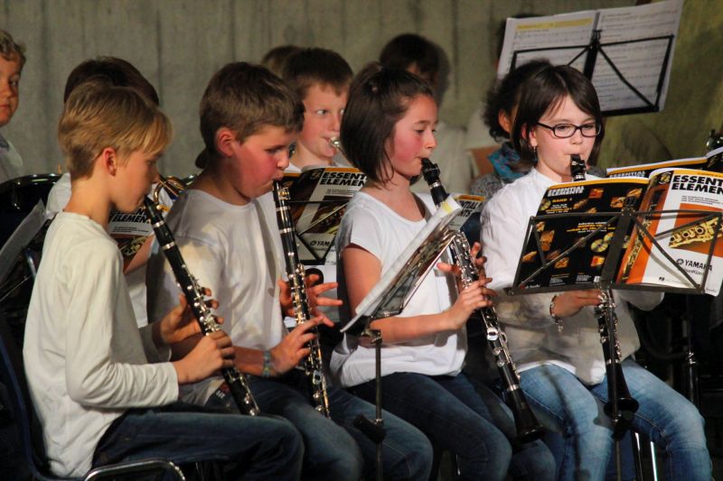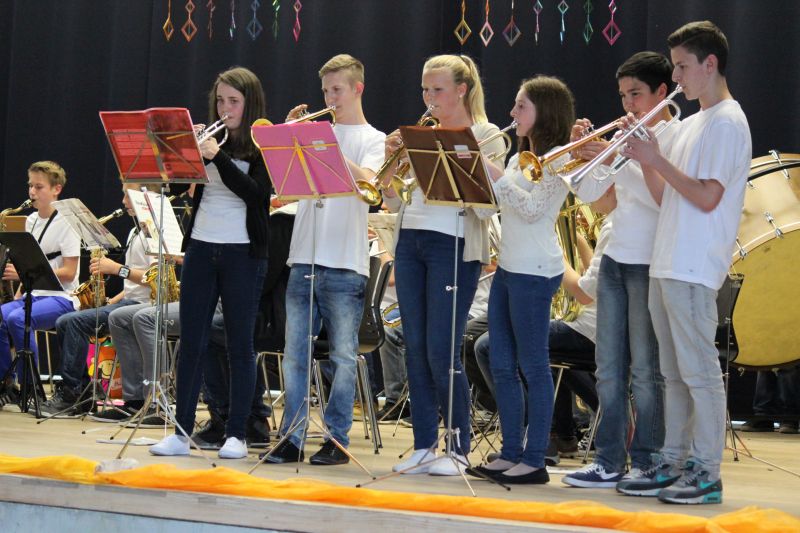 Zuerst spielte die fünfte Klasse unter der Leitung von Bernhard Wagner – das war erst der dritte Auftritt der Klasse. Gespielt wurden Stücke für ganze Blasorchester. Von Old McDonald bis zum Bananaboat Song war alles dabei.
