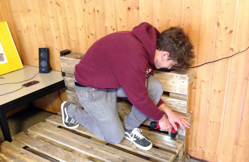 - Leon (J1) arbeitete am Konzept für die Nachhaltigkeit des Raumes mit und half in der Möbelgruppe bei Putz- und Instandsetzungsarbeiten von alten Möbeln.