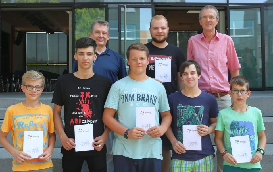 Den Landolinuspreis, der vom Freundeskreis der Heimschule St. Landolin für besondere Verdienste um die Schulgmeinschaft verliehen wird, übergab Wolfgang Mutter an die Mitglieder der Licht- und Tontechnik-AG Jeremias Huber, Colin Marx, Martin Pfetzer, Simon Röderer, Max Trotter und Jan Schlotthauer unter der Leitung von Franz-Georg Goletzko. Bei unzähligen Veranstaltungen im Laufe des Schuljahres wie Konzerten, Theater- und Musicalaufführungen sorgte dieses Team dafür, dass alle Akteure immer gut zu hören waren und im rechten Licht erschienen. Neben dem technischen Geschick hob Wolfgang Mutter hierbei vor allem die Zuverlässigkeit und Teamfähigkeit heraus, die das Schulleben bereicherten.