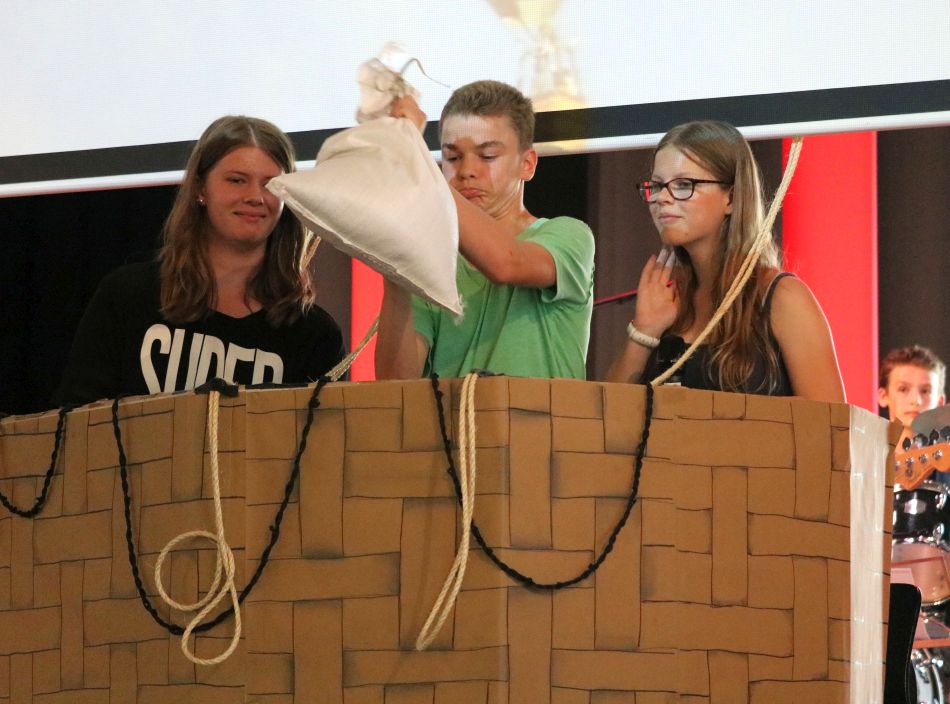In den beiden Gottesdiensten zum Schuljahresabschluss, der von den Religionslehrern Daniel Kurz, Patrick Berg, Bernd Schirkonyer und Schulseelsorger Steffen Reich gestaltet und von der Tau-Band unter der Leitung von Daniel Gaschick musikalisch begleitet wurde, wurde das Motiv einer Heißluftballonfahrt aufgegriffen. Über den Dingen schwebend verschafft sie einem Abstand und eine neue Perspektive. So konnten im gemeinsamen Nachdenken, Singen und Beten alle Sorgen und Schwierigkeiten des vergangenen Schuljahres „über Bord“ geworfen werden und nochmals dankend auf alles, was gelungen und gewachsen ist, zurückgeblickt werden.