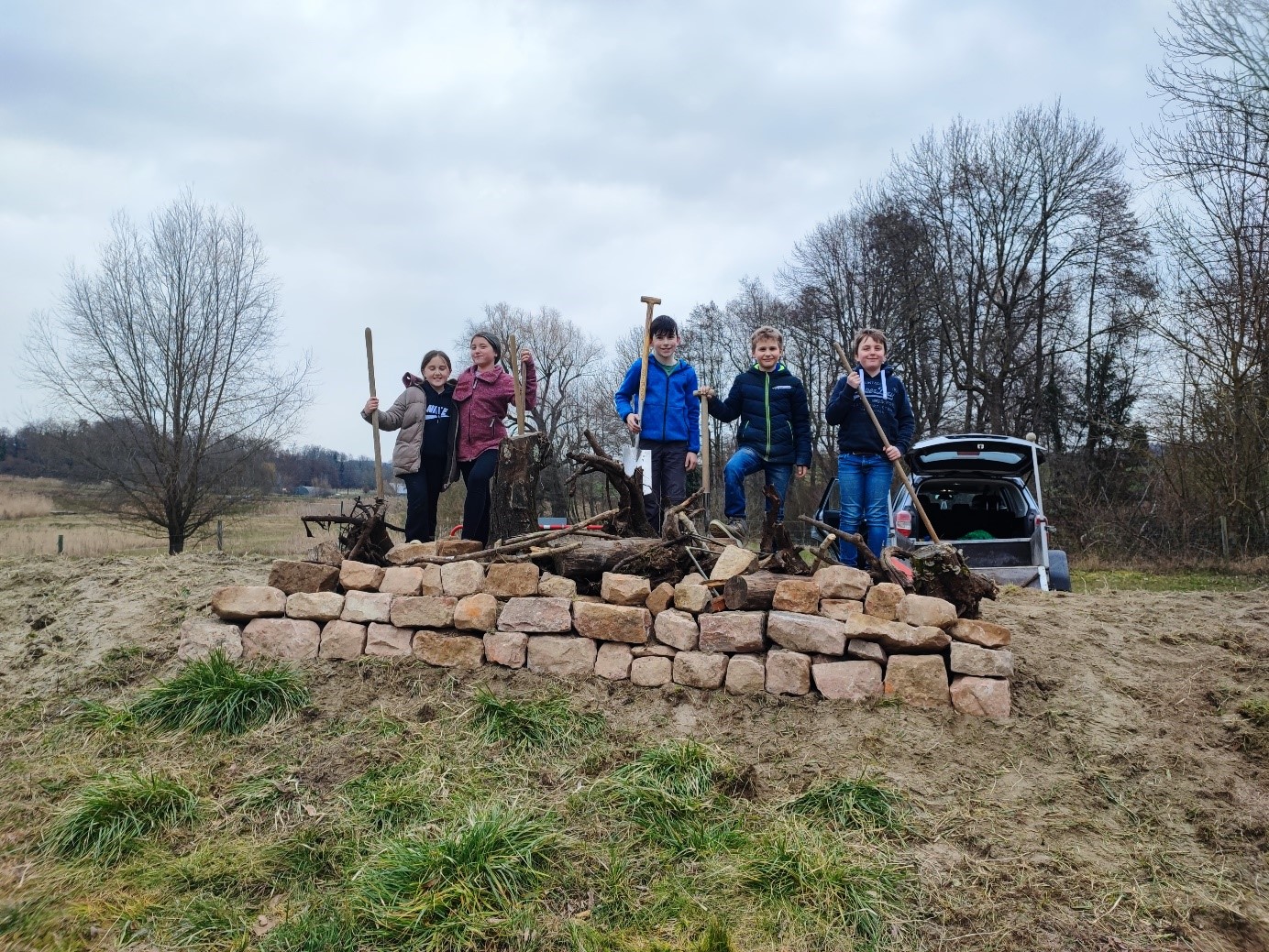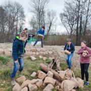 Der nach Süden weisende Sandwall war über die Jahre zugewachsen. Die Schülerinnen und Schüler der Naturschutz-AG entfernten mit Hilfe von Herrn Bing die Pflanzen und ergänzten den Wall durch eine Trockenmauer und Totholz, sodass auch Reptilien hier einen Rückzugsort finden. Der Frühling kann kommen und die neuen Bewohner einziehen.