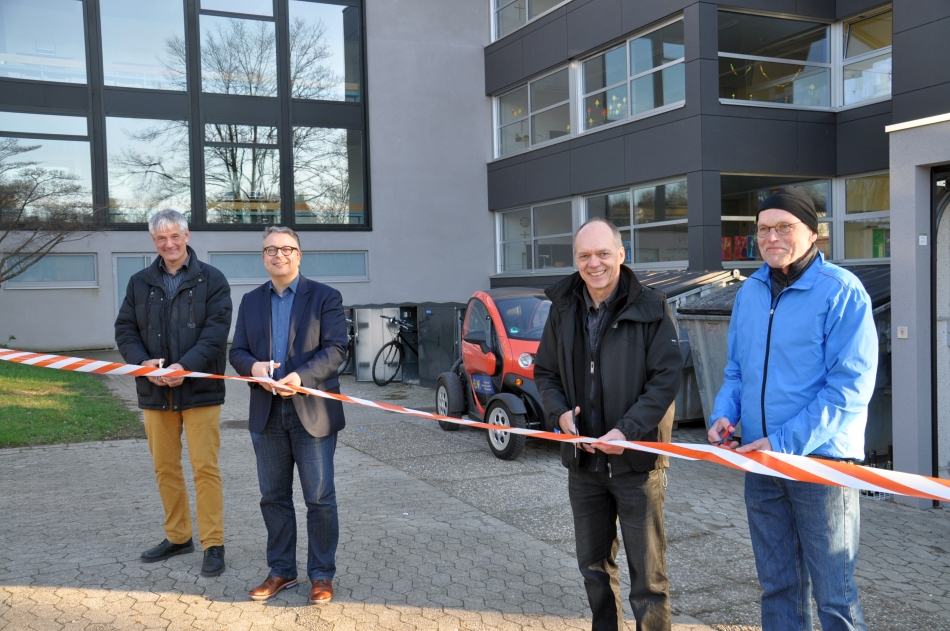 Die auf den ersten Blick unscheinbare Garage und Boxen haben es in sich: Erstens zeigen sie Schülerinnen und Schülern den vollständigen Weg der Sonnenenergie von der eigenen Anlage über die Ladestationen hin zu den Batterien in Auto und Fahrrädern. Zweitens können die E-Bike-Boxen über den Verein gemietet werden, um E-Bikes wettergeschützt und sicher – und samt Lademöglichkeit – an der Schule abzustellen. „Wir wollen damit den Umstieg von den Elterntaxis hin zum E-Bike fördern“, so Reinhard Kastner. Und drittens bietet die Garage für den Twizy nun die Möglichkeit, das Car-Sharing-System des Helios Solarvereins auszubauen. Bisher war das Auto im Schulkeller geparkt und daher von außen nicht erreichbar. Schulleiter Eberhard Pfister erklärte, dass in den kommenden Wochen für Vereinsmitglieder über den Transponder, den alle Mitglieder der Schulgemeinschaft ohnehin schon haben, auch die Buchung des Twizys und das Öffnen der Garage ermöglicht werden soll. Somit wäre hier ein unkompliziertes und günstiges E-Car-Sharing-Angebot geschaffen – und der Verein könnte einige neue Mitglieder gewinnen. Angesichts dieser Aussichten wünschte sich Reinhard Kastner im Namen des Vorstands nur eins: „Viel Sonne, unfallfreie Fahrten und einen Aufbruch in umweltfreundliche Zeiten.“