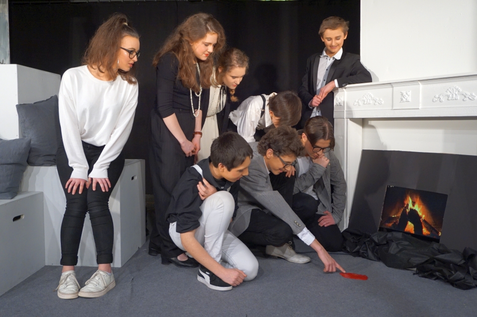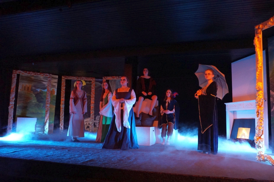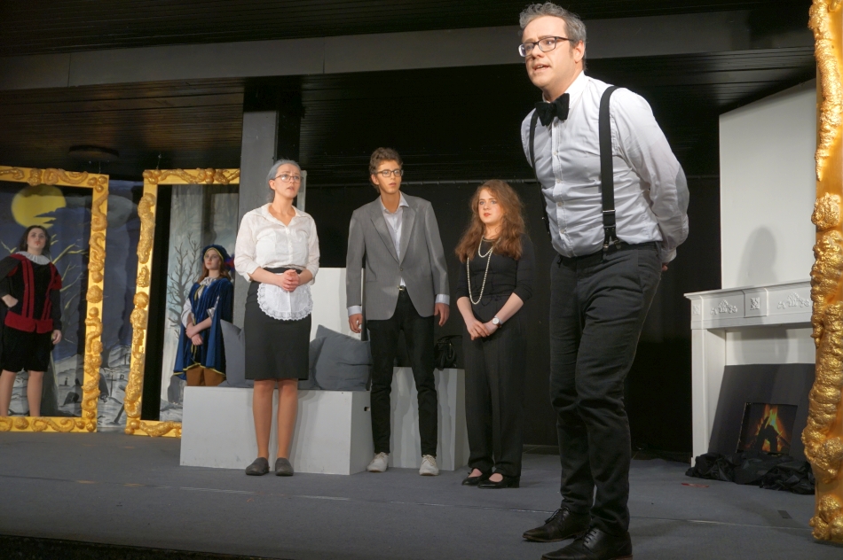 Die Theater-AG unter der Leitung von Sandrine Remmeau und Daniel Kurz brachte diesen Spielwitz in zwei sehr gut besuchten Aufführungen hervorragend auf die Bühne. Die Erzählung spielt in einem englischen Schloss, etwas gespenstisch und typisch britisch zieht Nebel auf. Auf der Bühne dominiert die Ahnengalerie: lebensgroße beleuchtete Bilder mit Ahnen, die immer wieder auferstehen und mitspielen – eine raffinierte choreographische Idee des Regieteams mit einem eindrucksvollen Bühnenbild (Bernhard Fehling mit der R7 und Franz Ostermann mit der G10).