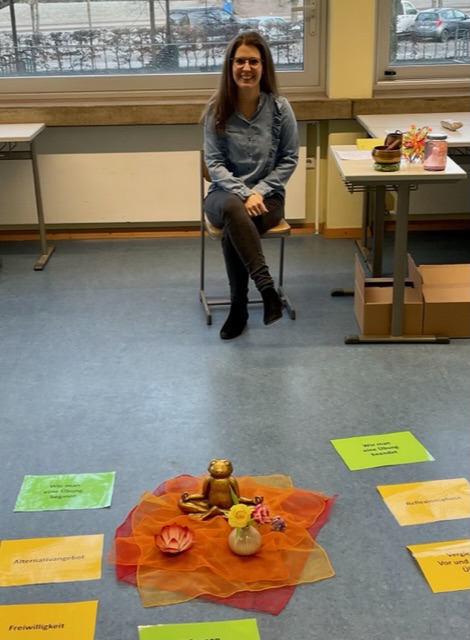 Sonja Haag, die selbst durch Christopher Willard zur Achtsamkeitslehrerin ausgebildet wurde, leitete hierzu mit einer Vielzahl verschiedener Achtsamkeitsübungen die Kursteilnehmerinnen und -teilnehmer dazu an, inmitten des trubeligen Schulalltags innezuhalten, im Moment anzukommen, die eigenen Emotionen wahrzunehmen und sich über die jeweiligen Erfahrungen auszutauschen. Dabei verloren sich die Teilnehmerinnen und Teilnehmer im wirbelnden Glitzermoment des Zauberglases, praktizierten die fünf Fingeratmung, erlebten sich als Spiderman, lauschten dem verklingenden Ton der Klangschale und klopften sich den Alltag aus Armen und Beinen.
