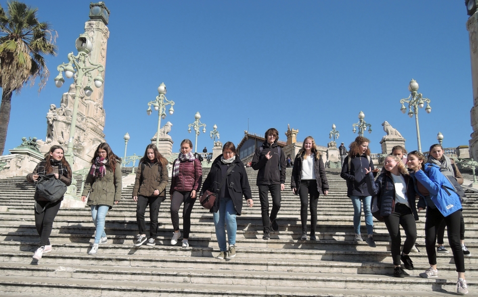 Nach einer langen Zugfahrt kamen wir am Montag in Lyon an, wo auch schon unsere „Corres“, d.h. unsere Austauschpartner, warteten. Mit ihnen gingen wir direkt in den Unterricht und hatten anschließend Zeit, unsere „Corres“ und ihre Familien kennen zu lernen. Am nächsten Tag machten wir uns ein Bild von Lyon: Wir besuchten mit der Deutschlehrerin unserer Austauschpartner die Markthalle ‚Paul Bocuse‘. Ebenso besichtigten wir den ‚Parc de la tête d’or‘, in welchem wir die botanischen Gärten anschauten. Am Nachmittag gingen wir gemeinsam mit unseren „Corres“ in den Klettergarten, welcher etwas oberhalb Lyons lag, wo wir einen schönen Ausblick auf die Stadt hatten. Am Mittwoch wurden wir in der Schule vom Schulleiter offiziell willkommen geheißen und hatten ein gemeinsames Frühstück mit unseren Austauschpartnern. Danach besichtigten wir das Stadtviertel St. Jean, in welchem wir auch eine spannende Führung hatten. Den Nachmittag hatten wir dann frei und haben alle zusammen etwas unternommen.
