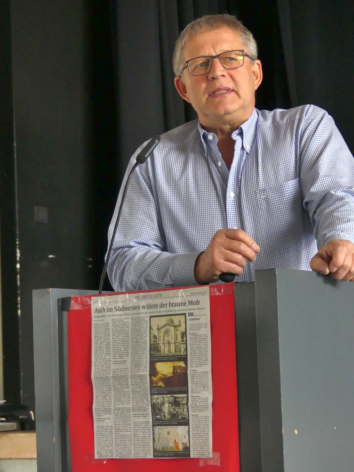 p1040111_0.jpgSo wurden nach Kleins akribischer Suche im Amt Lahr in jener Pogromnacht 109 Männer festgenommen, „in Schutzhaft genommen“, wie es die SA der Bevölkerung glaubhaft machen wollte. Die SA habe die Tatsachen verdreht, indem sie Zerstörungen einer angeblichen „Volkswut“ zurechnete. Die Bürgermeister der Gemeinden im Amt Lahr habe man vorsorglich zu einer Veranstaltung in Lahr einbestellt, damit sie nicht eingreifen beziehungsweise verantwortlich gemacht werden konnten. Jugendliche der HJ-Schule in Lahr hätten gewütet, maßgeblich unterstützt durch den damaligen Ettenheimer Bürgermeister Eduard Seitz und den NSDAP-Kreisleiter Richard Burk. Die SA-Leute seien außerdem an diesem Abend in heftiger Feierlaune gewesen, da die Niederlage beim Hitler-Putsch am 9. November 1923 von der NS-Partei seit Jahren an diesem Tag als „Erfolg“ der Bewegung gefeiert worden sei. Das Attentat auf den Botschaftssekretär von Rath in Paris habe den SA-Leuten als willkommener Anlass gedient, „die Sau rauszulassen“, so Norbert Klein.