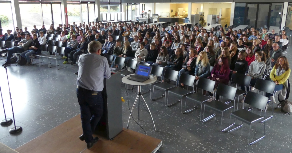 Eben war noch quirliges Treiben in der Mensa gewesen, nun führte Klein mit historischem Bildmaterial zu den erschreckenden Vorgängen jener Tage. Bereits nach der Machtübernahme durch die NSDAP habe es Bücherverbrennungen gegeben, seien Geschäfte von Juden boykottiert worden. Beleidigung, Ausgrenzung und Diskriminierung von Juden waren die Folge. Mit der Einführung der sogenannten Nürnberger Gesetze seien sie mit dem Zwang zum Namenszusatz Sara und Israel abgestempelt worden. Bis zum Beschluss der Wannseekonferenz 1942 sei es zunächst hauptsächlich darum gegangen, die Juden loszuwerden. Dahinter stand bei der NSDAP die Absicht, an das Vermögen dieses Bevölkerungsteils zu kommen.