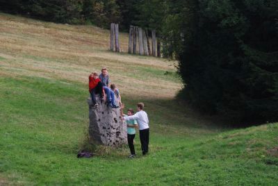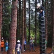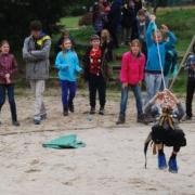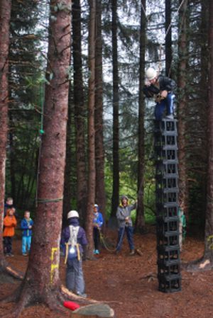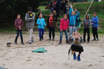 Am darauffolgenden Tag haben wir uns in zwei Gruppen eingeteilt. Die erste Gruppe hat Bogen geschossen und die zweite hat ein Gefängnisspiel gespielt. Dann haben wir getauscht. Am Nachmittag mussten wir Klettergurte und Helme anziehen, weil wir auf Kisten und Bäume geklettert sind. Abends hat uns Herr Förderer eine kleine Geschichte vorgelesen.