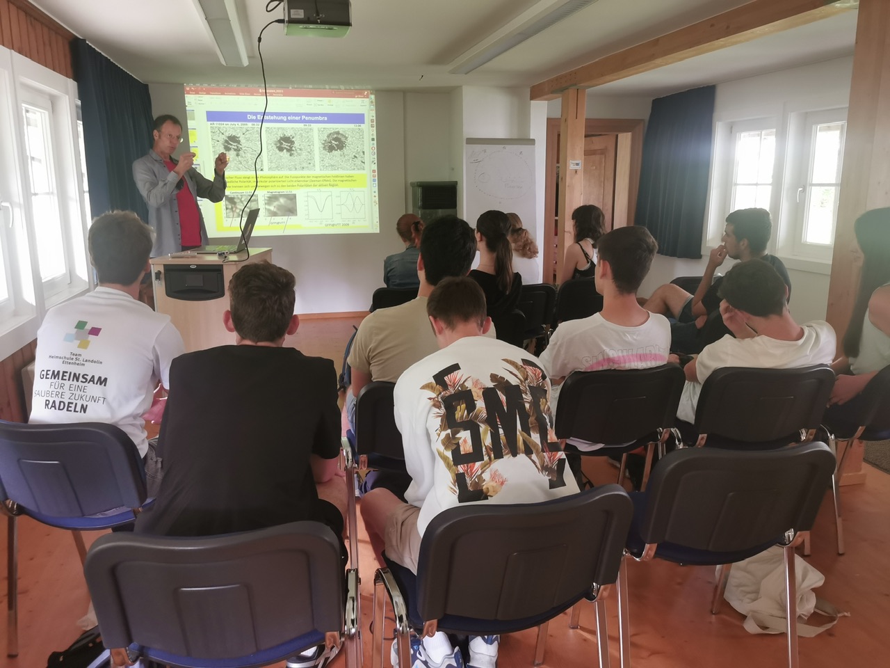 Alles begann, wie an jedem anderen Schultag auch, an der Schule, nur leider ziemlich früh, schon um 7:20 trafen wir uns, um möglichst pünktlich ans Observatorium auf dem Schauinsland zu gelangen. Glücklicherweise hat es uns der Astrophysiker Dr. Schlichenmaier, welcher uns das Observatorium zeigte, nicht übel genommen. Wir hörten zunächst eine Präsentation über das Forschungszentrum selbst, sowie der wortwörtliche Star des Instituts: unsere Sonne. Sonnenwind, Sonnenflecken und so weiter durften wir in diesem Schuljahr schon alle im Unterricht kennenlernen, also waren wir natürlich perfekt vorbereitet und wussten genau, worum es ging. Das keiner Fragen stellte, lag also nicht daran, dass wir nichts verstanden haben. Es traute sich bloß keiner.