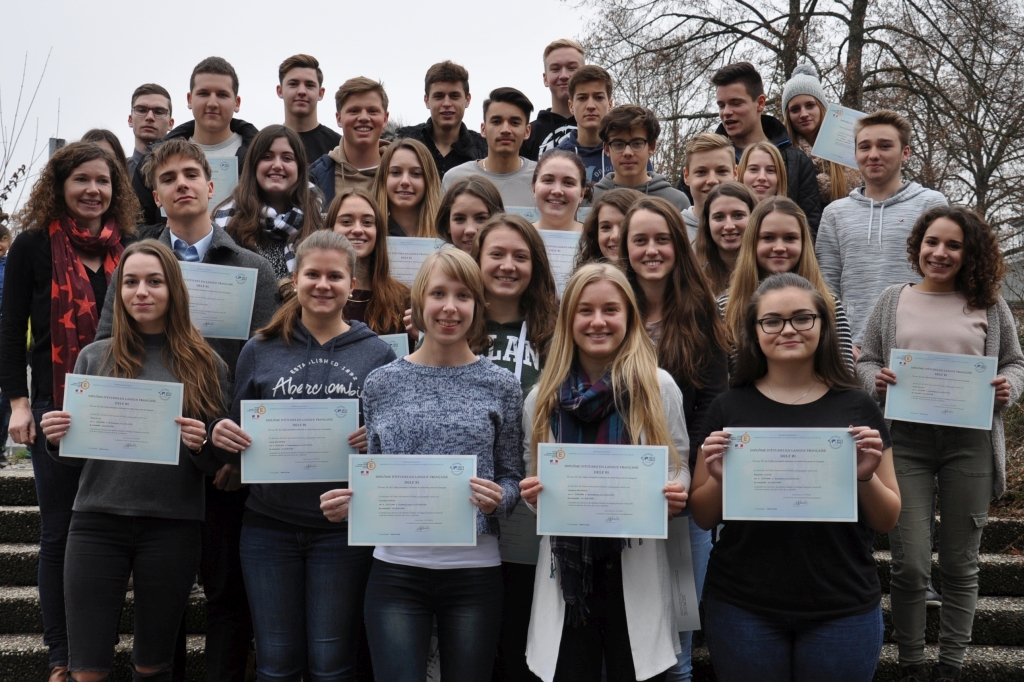 Kurz vor den Weihnachtsferien war es soweit: 36 Schülerinnen und Schüler der Jahrgangsstufe 1 und 2 erhielten ihre DELF-Zeugnisse. Sie hatten im Sommer 2016 die DELF-Prüfung (Niveau B1/B2) erfolgreich absolviert und können stolz auf ihre erzielten Ergebnisse sein. Wir gratulieren ihnen hierzu ganz herzlich: Félicitations!