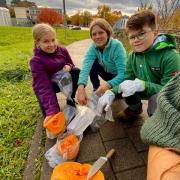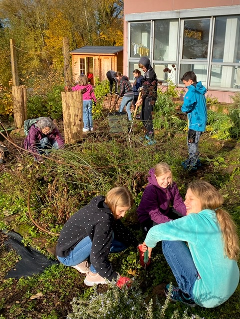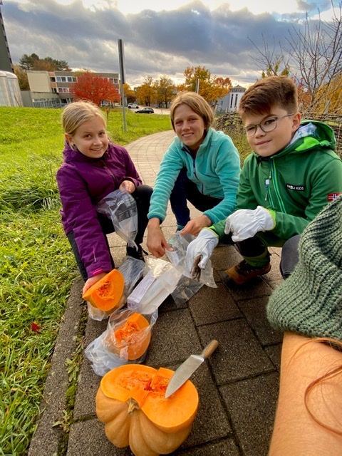 In den letzten Wochen konnten noch Kürbisse und Physalis geerntet werden, dann wird der Schulgarten winterfest gemacht. Dabei werden Stauden und Sträucher zurückgeschnitten und einjährige Pflanzen aus den Beeten entfernt. Alles wird einmal umgestochen, der Rasen ein letztes Mal gemäht und die Wege von Unkraut befreit. Außerdem müssen alle Werkzeuge und Gartengeräte gut gesäubert und das neue Gartenhäuschen aufgeräumt und ausgekehrt werden. Ganz schön viel Arbeit!