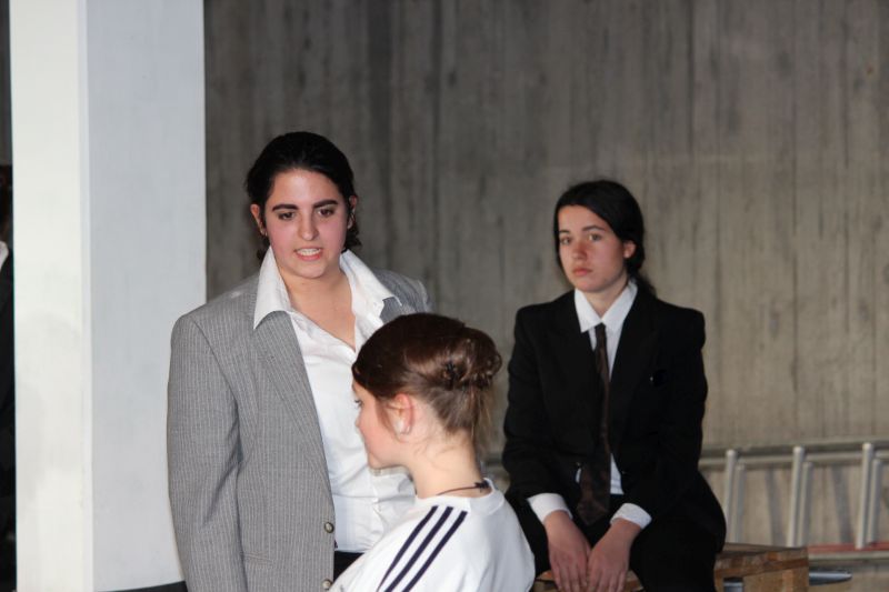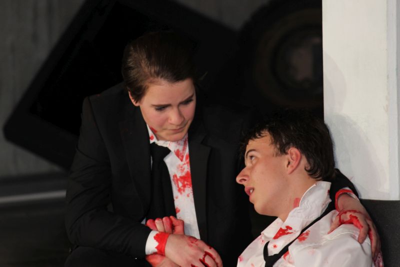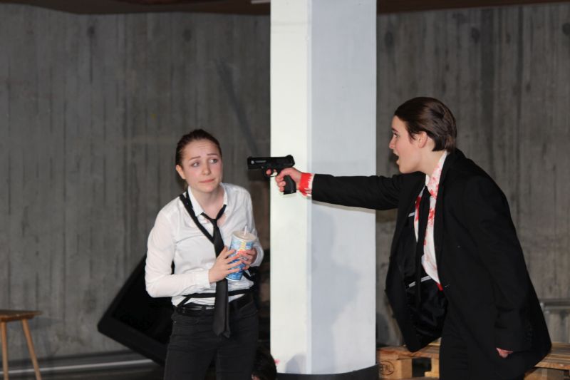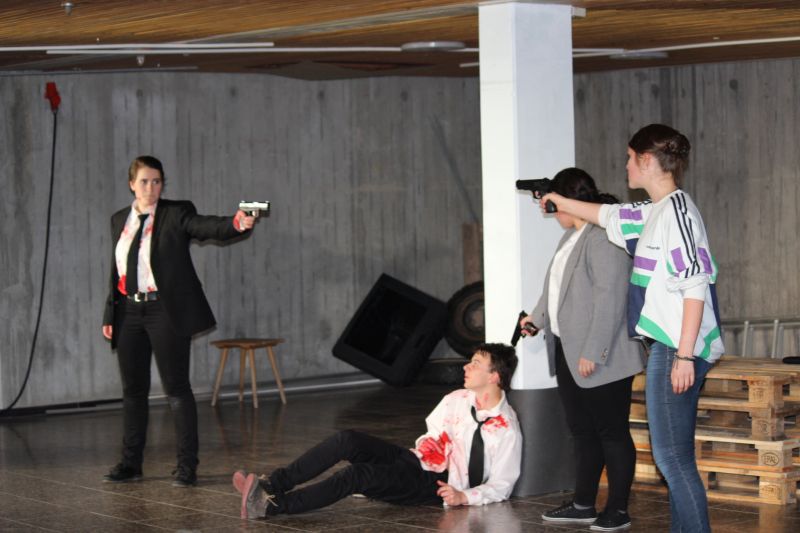In den Rollen der coolen, harten Jungs glänzten fast ausschließlich Mädchen, Sophie Zipf als Mr. White , Jessika Fink als Mr. Pink, Amelie Croin als Mr. Blonde, Jasmin Foßler als Mr. Brown und Olivia Altfuldisch als Mr. Blue. Mit einer diesem Milieu typischen Mimik und Gestik und einem entsprechend rüden und teils sehr lauten Umgangston spielten sie die knallharten Gangster überaus überzeugend. Auch bei den zahlreichen heftigen Wortgefechten blieb kein Zweifel, dass man es hier mit eiskalten Typen zu tun hat. Eine großartige Leistung bot auch Denise Freudenstein als kaltblütiger und unnachgiebiger Boss „Joe“, vor dem jeder Angst haben muss. Hervorragend war Josef Blum als Undercover-Cop, neben Marcel Nuchov als Mr Brown und Julian Senst als Nice Guy Eddie einer der wenigen männlichen Darsteller. Er spielte den schwer verletzten, lange Zeit im Sterben liegenden Mr. Orange so großartig, dass der Zuschauer einfach mit ihm mitleiden musste. Daneben machten die Licht- und Toneffekte sowie eine gute Maske die Aufführung zu einem echten Thriller. Insgesamt bot der Literaturkurs der Heimschule wieder einmal eine Glanzleistung schulischer Theaterarbeit.