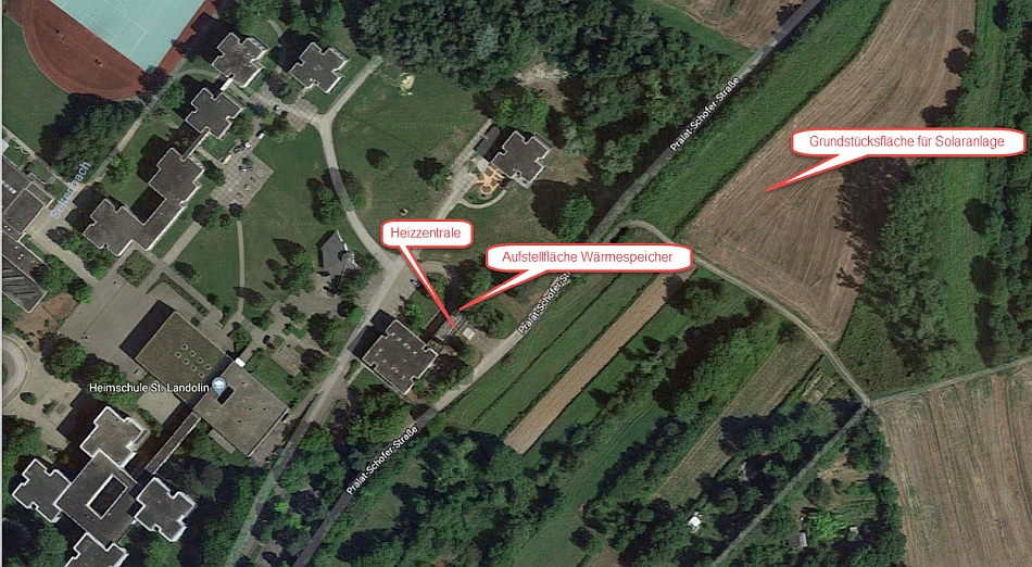 Zurzeit wird östlich des Heimschulareals auf dem Myßberg eine rund 1.800 qm große Sonnenkollektorenfläche errichtet. Mit der neuen Anlage und der Holzhackschnitzelheizung sollen zusammen nahezu 100 % Prozent der Wärmeversorgung der Heimschule St. Landolin, des angrenzenden Wohngebiets „Quartier am Ettenbach“ und weiterer Gebäude entlang der Otto-Stoelker-Straße CO2-neutral geleistet werden. Wie Schulleiter Eberhard Pfister informiert, können dadurch 225 Tonnen Kohlenstoffdioxid pro Jahr eingespart werden. Angesichts des Leitbildes der Heimschule St. Landolin, die Schülerinnen und Schüler dazu erziehen möchte, Verantwortung für die Zukunft der Gesellschaft zu übernehmen und sich dabei auch für die Bewahrung der Schöpfung einzusetzen, ist die umweltfreundliche Wärmeversorgung der Schule ein wichtiges Element, das sich nahtlos in andere Bemühungen der Heimschule einreiht, konkrete Akzente in Sachen Klimaschutz zu setzen. Nachhaltig unterstützt wird dieses Engagement durch den Schulträger, die Schulstiftung der Erzdiözese Freiburg. Deren Stellvertretender Direktor Ralph Schwörer betont, dass diese Anlage ein weiterer Schritt in Richtung klimaneutrale Diözese 2030 ist.