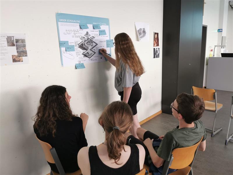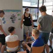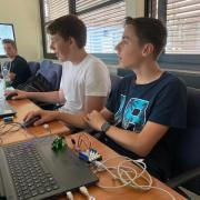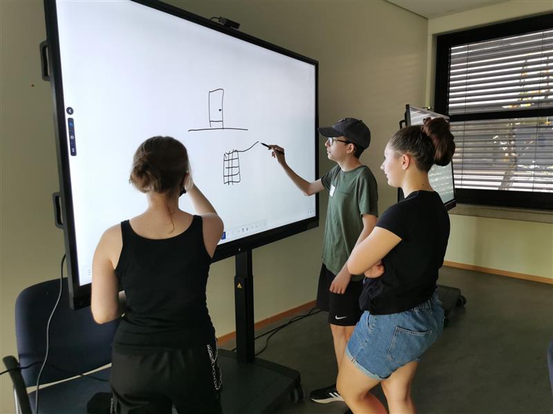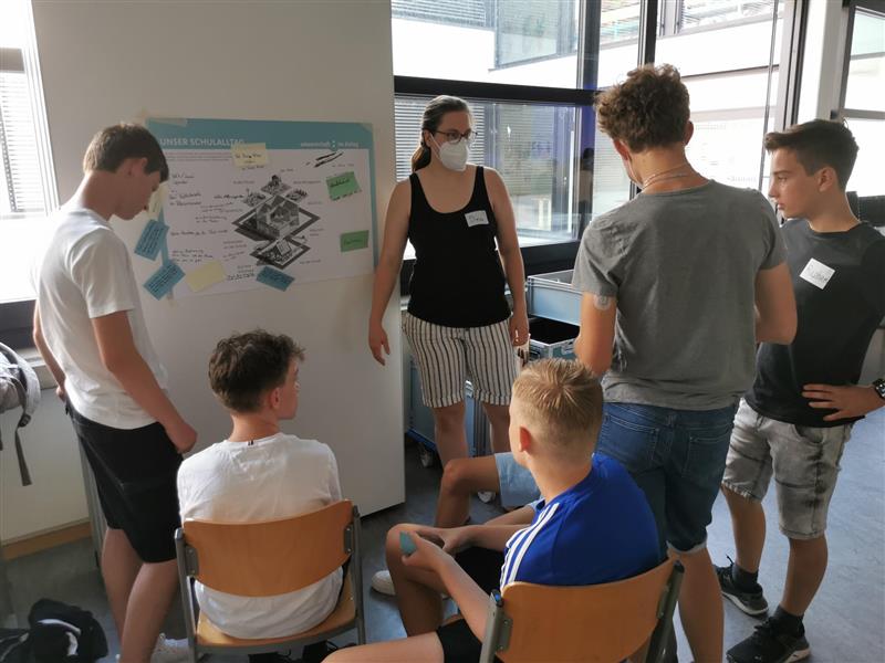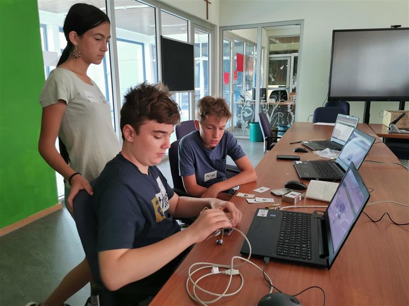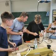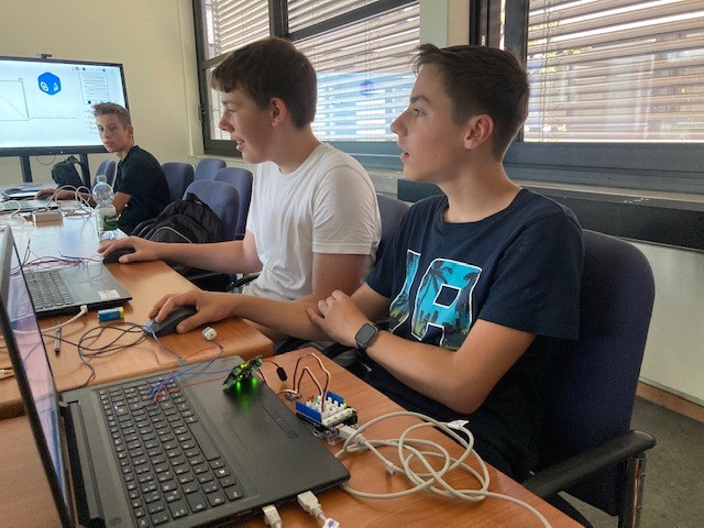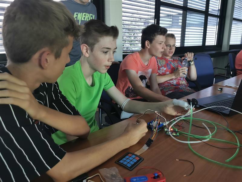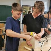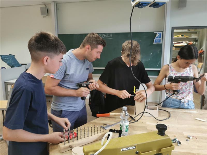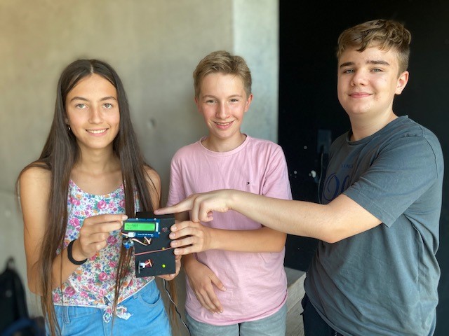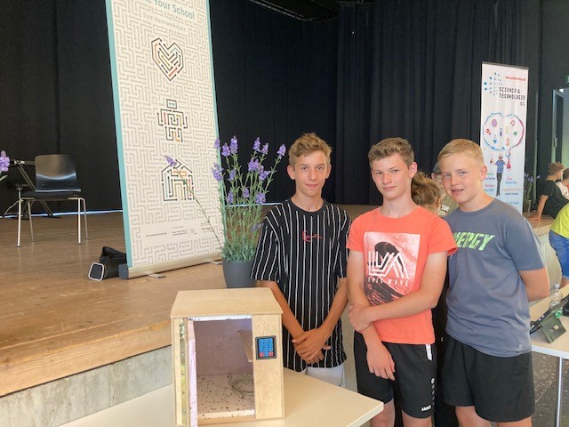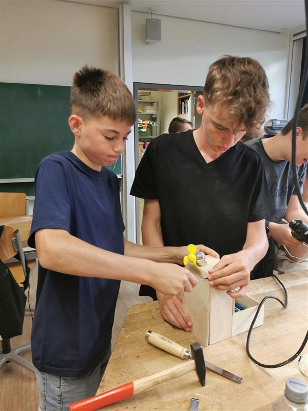 Luca, Luca und Tom aus der G08e beispielsweise entwarfen – wohl angespornt von den heißen Temperaturen – einen kleinen zahlenschlossgesicherten Kühlschrank. Wer hätte ihn nicht gern für Getränke und Vesper unter dem Schultisch? Eric, Ben, Jonathan, Joshua und Joshua aus der R09a tüftelten an einem Stiftspender – praktisch für alle, die gerne mal das Arbeitsmaterial vergessen. Und Annika, Cedric und Philipp (G08a) nahmen sich die bereits installierten CO2-Messgeräte zum Vorbild und konstruierten eine Lautstärkeampel für Klassenzimmer. Diese zeigt an, wenn es laut und wann eindeutig zu laut im Klassenzimmer ist. Das Fazit der Schülerinnen und Schüler ist eindeutig: Die Tüftelei hat ihnen großen Spaß gemacht. Vor allem, dass anfangs Dinge auch schief gegangen sind oder scheinbar unlösbare Probleme wie das Programmieren mithilfe der Mentoren gelöst werden konnte, war eine gute Erfahrung.