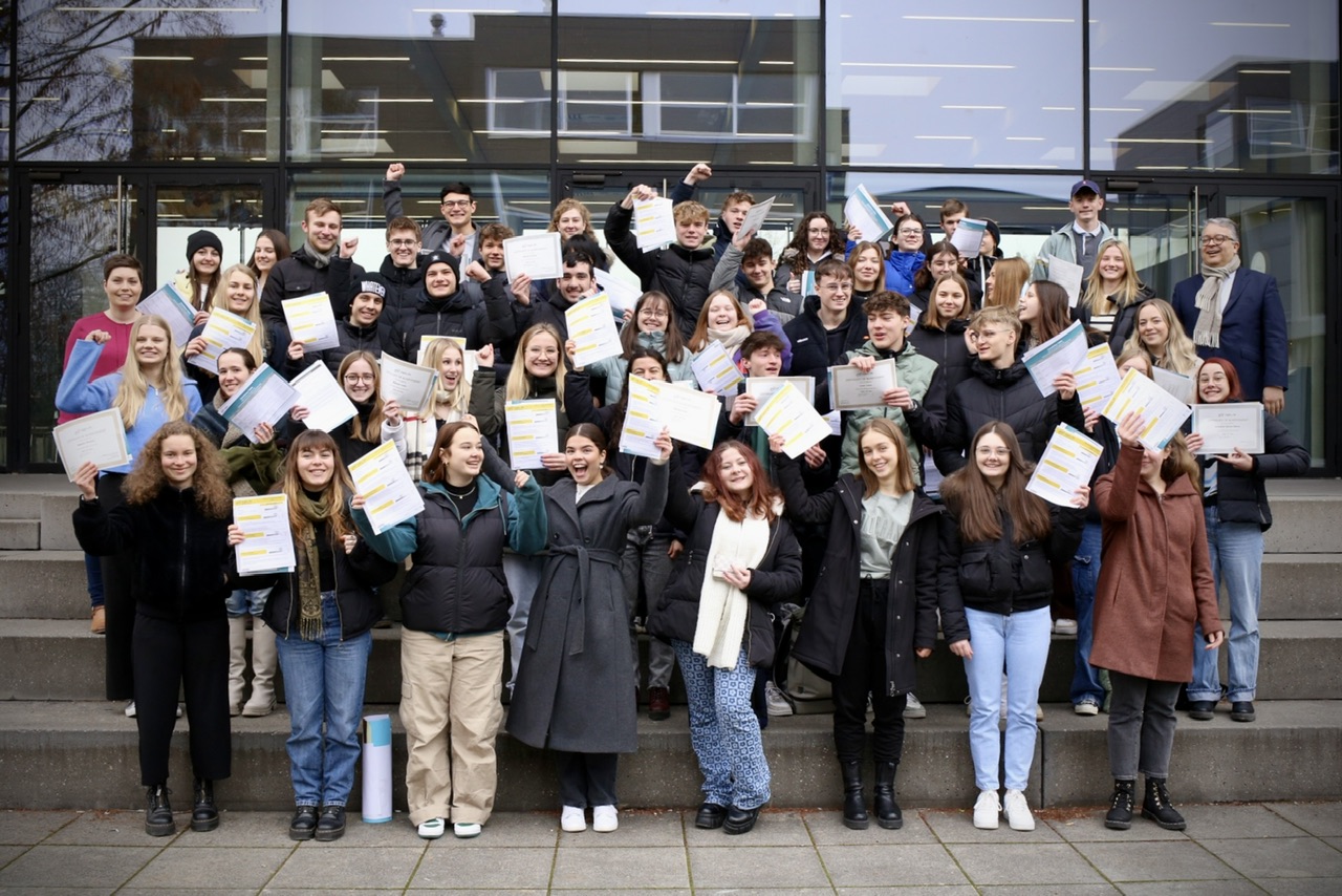 Herausragende Ergebnisse erzielten insbesondere Elias Fäßler (K2), Timo Stettin (K2) und Ian Kaufmann (W13), die mit ihrer Gesamtpunktzahl das C1-Niveau erreichten. Dieses Level ist die fünfte Englisch-Kompetenzstufe des Gemeinsamen Europäischen Referenzrahmen für Sprachen (GER) – eine Sprachniveau-Skala, die vom Europarat eingeführt wurde. Die fortgeschrittenen Sprachkenntnisse der C1-Schüler reichen über die im Abitur geforderten Kompetenzen hinaus und attestieren den Schülerinnen und Schülern, dass sie selbstständig kommunizieren und sich präzise über eine Reihe von Themengebiete und Situationen hinweg austauschen können, ohne sich vorher explizit darauf vorbereiten zu müssen. Gratulation!