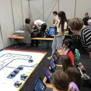Die Physik stellte ebenfalls zwei Experimente zur Verfügung. Man konnte mit kleinen lächelnden Robotern einen Parcours entlangfahren und mit der Technik dieser rollenden Spaßkanonen herumspielen. An der zweiten Station war Bastelaction angesagt. Die Kinder haben sich dort regelrecht verkünstelt, um den schönsten beziehungsweise coolsten Roboter zu gestalten. Damit der selbstgebastelte Roboter einen Kopfstand auf dem Zeigefinger machen kann, mussten die Kinder den Schwerpunkt hierfür herausfinden und die zwei Münzen, die für diesen sorgen, an der richtigen Stelle platzieren.