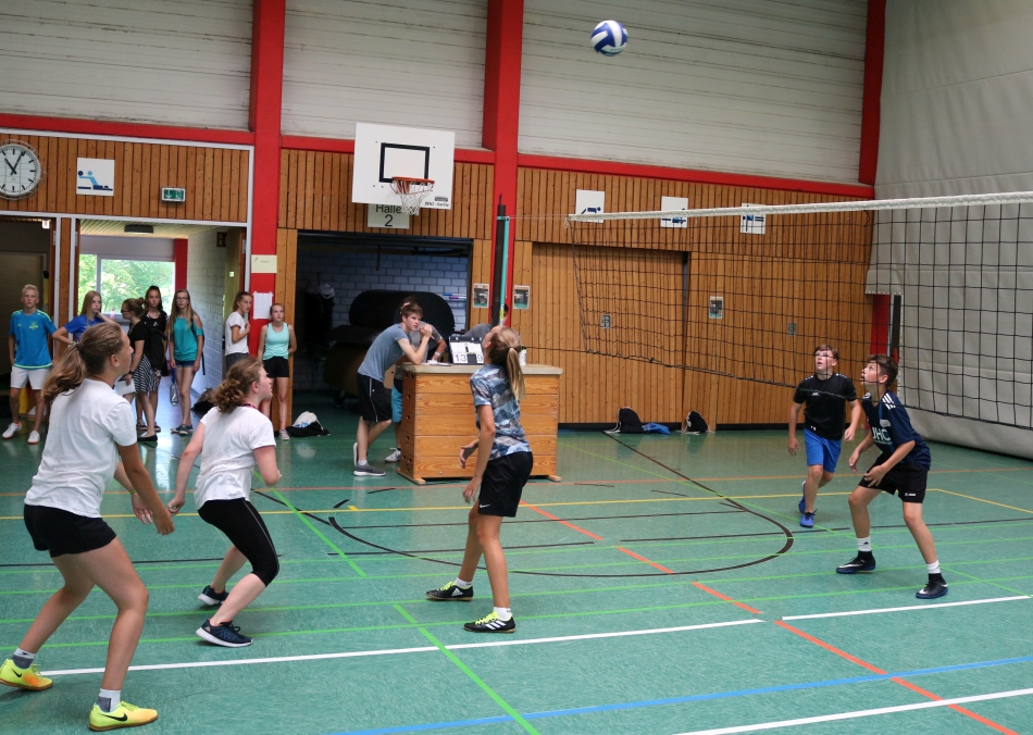 Im Anschluss an die Heimschulympics fand in diesem Jahr ein Beach-Volleyballturnier mit sechs Mannschaften, darunter auch ein Lehrerteam, statt. Bei bestem Sommerwetter und in entspannter Stimmung konnte das J2-Team das Turnier für sich entscheiden.