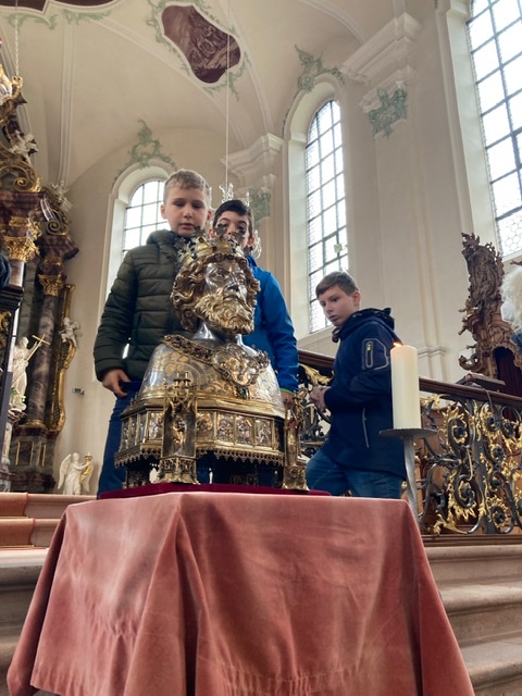 Im Anschluss an die Erzählung durften die Schülerinnen und Schüler das Büstenreliquiar des heiligen Landolin besichtigen. An der Stelle seines Todes sollen fünf Quellen entsprungen sein und er galt als Patron für Augenleiden. Es gibt auch heute noch viele Menschen, die ihr Trinkwasser aus der Landolinsquelle holen oder zur Wallfahrtkirche in Ettenheimmünster pilgern. Die Schülerinnen und Schüler füllten Ihre Flaschen ebenfalls an der Landolinsquelle und waren überrascht, wie gut echtes Quellwasser schmeckt!