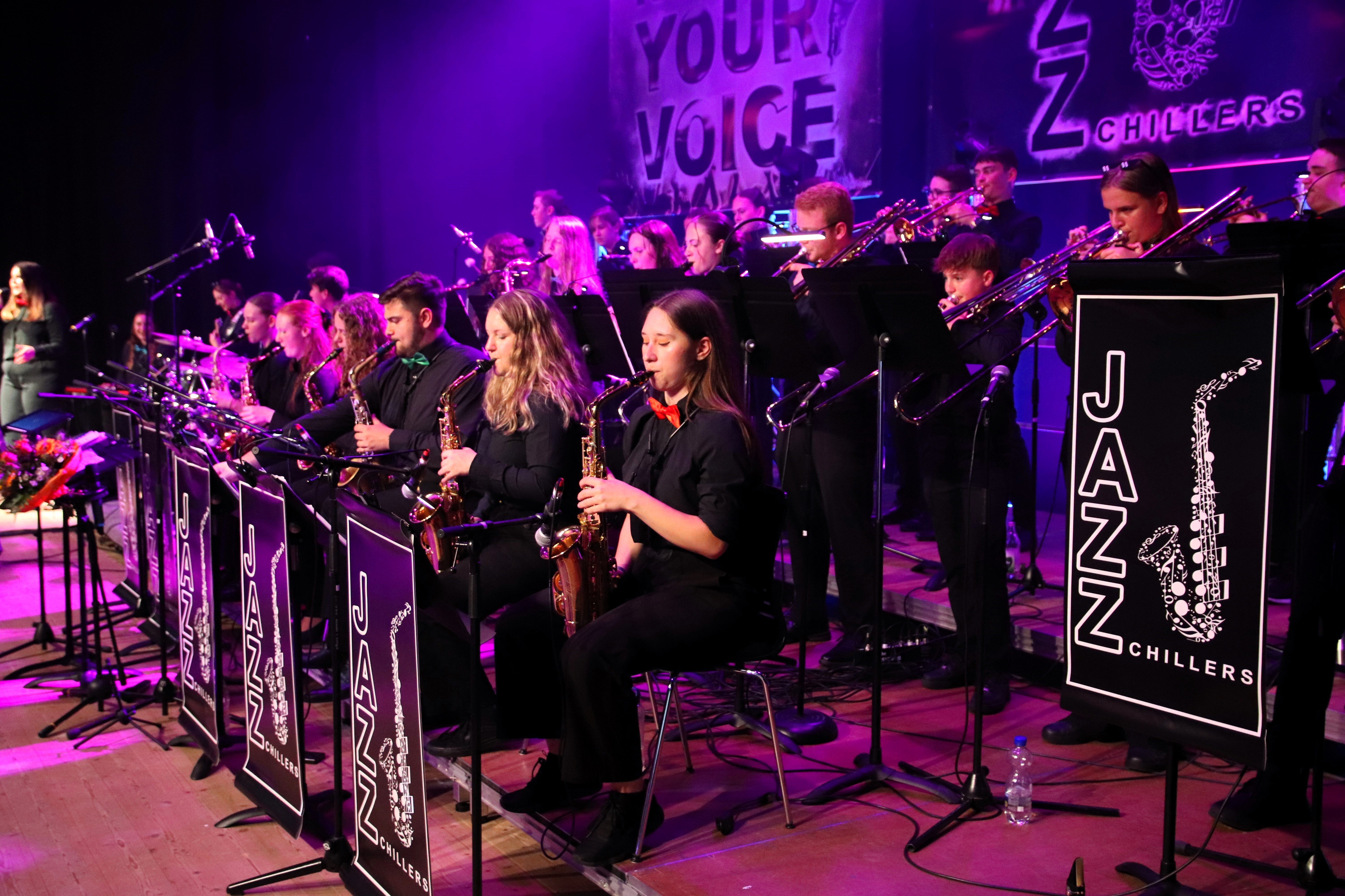 Und dann begann sie – die Show der Jazz Chillers - mit einem lauten Knall, einem geschlossenen Vorhang und einem Countdown von Bandleader Markus Albu höchstpersönlich. Dieser war mit seinen Jazz Chillern die Wette eingegangen, dass das Publikum die ersten 15 Minuten durchtanzen würde. Diese Wette sollte sich schnell erfüllen. Denn schon beim ersten Song 7 Nation und Danzer tanzte das Publikum begeistert mit. Spätestens bei „Let me entertain you“ bewegte sich die gesamte Aula. Auch dieses Mal riss Sängerin und Solistin Vanessa Müller das Publikum gemeinsam mit. Levin Müller überzeugte mit einem schwierigen Saxophon Solo und Moritz Ibert mit einem anspruchsvollen Trompetensolo.