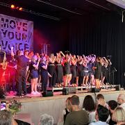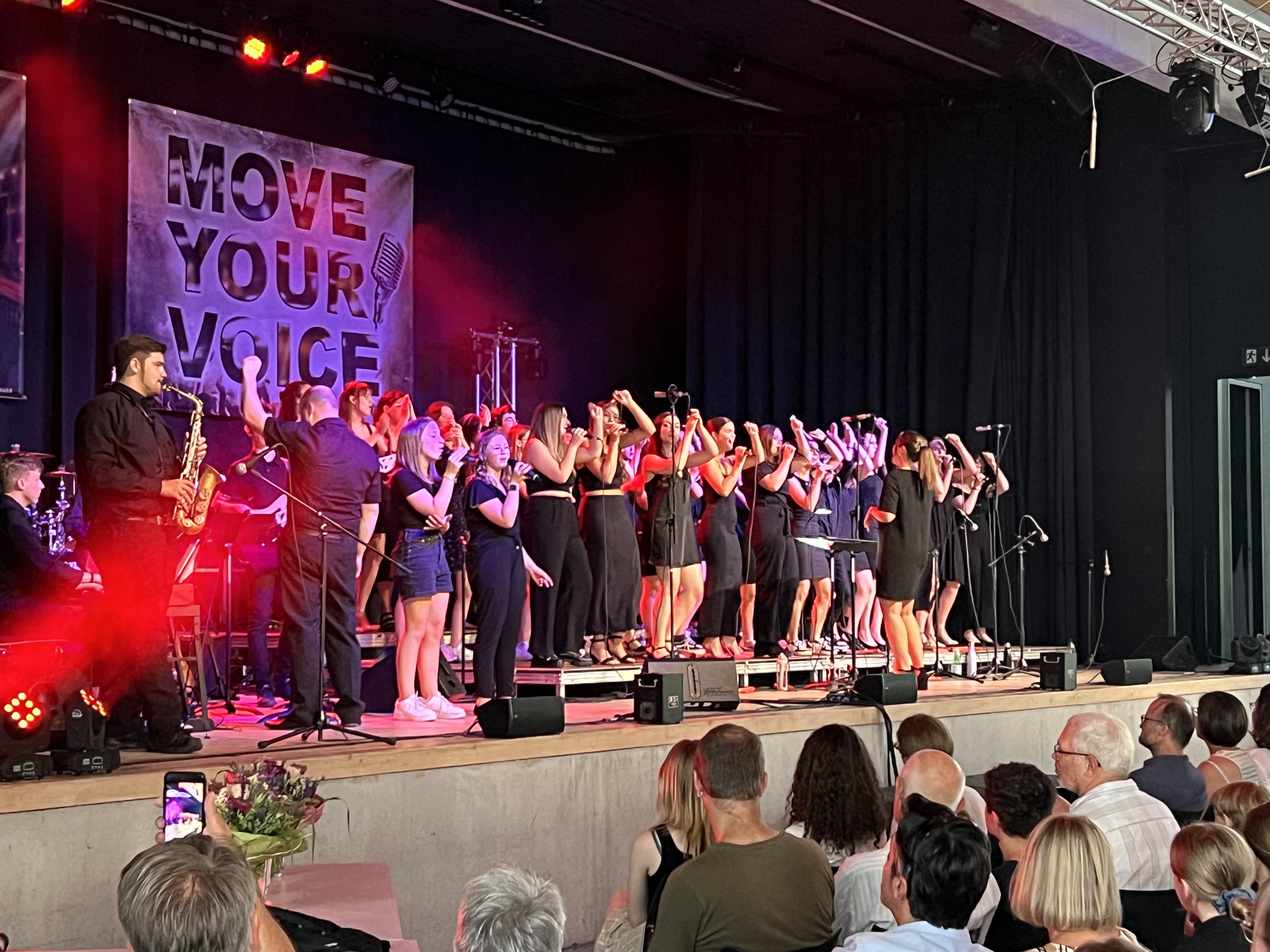 Im Duett zeigten im Anschluss Lena Bühler und Ekaterini Kalograna ihre Gesangskünste mit dem Song „Royals“. Das Versprechen da zu sein, gibt anschließend Eva Kölblin dem Publikum mit dem Song Mit „I’ll be there“ und löste dieses Versprechen mit ihrer atemberaubenden tiefen Stimme dann auch sofort ein! Dass Move Your Voice auch Tanzen kann, beweist der poppige Schulchor dann bei ihrem nächsten Song „Happy Ending“. Mit ihrer tollen Stimme lud Manon Kölblin das Publikum ein, nochmal die Taschenlampen einzuschalten und mitzutanzen. „Ihr wollt sie – ihr bekommt sie“ – so wird anschließend die berühmte Heimschulsolistin, Vanessa Müller, angekündigt. Mit „What a feeling“ rufen Solistin, Chor und Band großes Gänsehautfeeling hervor und bringen die Stimmung zum Kochen!