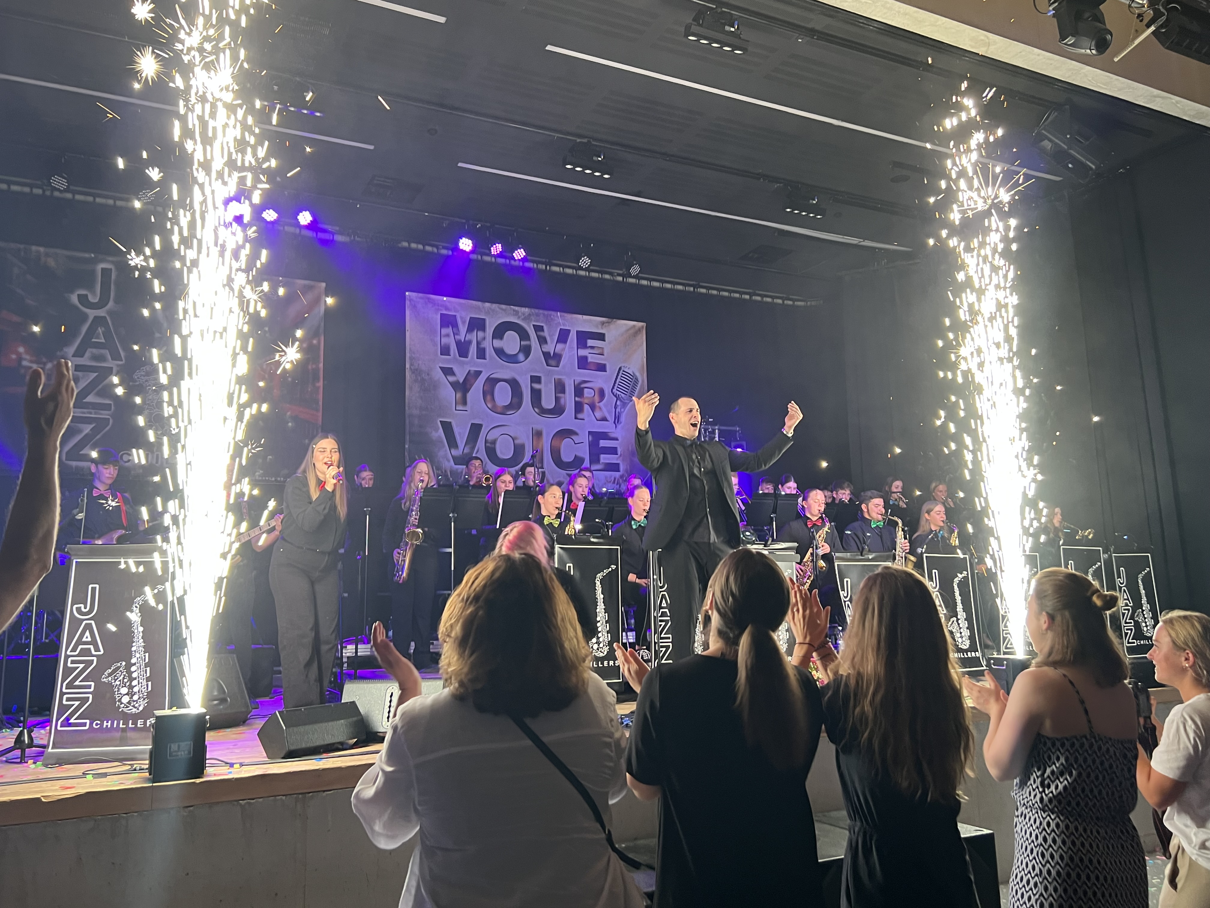 Eine Mischung aus Soul, Pop und Funk bot der ursprünglich einmal von Amy Winehouse gesungene Song „Valerie“, bei welchem Vanessa Müller dem Publikum ihre Gesangskunst schenkten und den Song allen Valeries widmete. Beim Song „Chicken“ zeigen Julia Kollmer und Levin Müller mit ihrem Unisolo am Saxofon sowie Benedikt Hirzel an der Bassgitarre ihr großes musikalisches Talent. Den groovenden Sound erhält dieses Stück nämlich ganz besonders durch seine schnellen Läufe an der Bassgitarre sowie am Saxofon. Anschließend luden die Jazz Chiller ihr Publikum dazu ein, sich mit ihnen glücklich und frei zu fühlen – und anders kann man auch gar nicht, wenn die Jazz Chillers „Feeling Good“ von Michael Bublé auf die Bühne bringen und Vanessa Müller singt. Nach einem so grandiosen Ende verlangte das Publikum das Publikum lautstark nach einer Zugabe. Mit seinen Jazz Chillern hatte Markus Albu gewettet, dass das Publikum bei der Zugabe „den Laden“ abreißen würde. Und dazu kam es dann auch, denn die Big Band spielte ein von Markus Albu selbst arrangiertes Medley, das viele berühmten Stücken wie Rolling in the Deep, Girl on Fire, Titanium enthielt, und zusammen mit einer grandiosen Lightshow die Stimmung in der Aula tatsächlich zum Beben brachte!