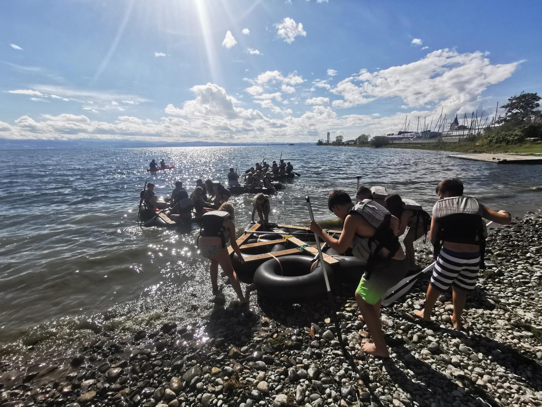 Als der Donnerstag anbrach, richteten wir uns alle für das Stand-up-Paddling und für den Floßbau. Mit jeder Wasseraktivität waren wir jeweils zwei Stunden beschäftigt. Nach einer kurzen Begrüßung wurde uns erklärt, wie man mit dem Paddel und dem Board umgehen muss. Schön für fast alle war das Baden im an dieser Stelle nicht tiefen Bodensee. Natürlich trugen  wir trotzdem Schwimmwesten. Am späten Nachmittag gingen manche zurück zur Jugendherberge, andere in die Stadt. Natürlich wurde wieder gespielt, es gab abends eine Party mit Donuts – eine Entschuldigung für das Missverständnis – und irgendwann gingen alle schlafen.