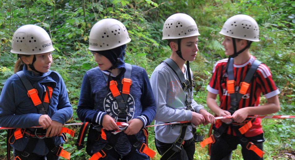 Die erste Herausforderung wartete gleich nach der Ankunft in der Jugendherberge auf uns: Betten beziehen. Als das geschafft war, wanderten wir zu einem alten Turm und genossen die Aussicht. Am zweiten Tag trafen wir dann endlich die Erlebnispädagogen Josef und Simeon. Mit ihnen spielten wir den ganzen Tag Spiele mit der gesamten Klasse, die unsere Klasse vor verschiedene Herausforderungen stellten. Wie schwer die Aufgabe jedoch auch war, ob gemeinsam einen Sumpf zu durchqueren oder Paula zu retten, wir haben sie als Klasse geschafft! Das alles war sehr lustig. Und am Abend haben wir eine Nachtwanderung mit einer Mutprobe gemacht, was auch sehr aufregend war.