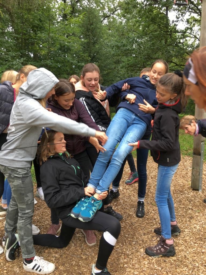 Nach einer kurzen Nacht ging es zu einer Orientierungsrallye in der näheren Umgebung. In zwei Gruppen zogen wir mit einer Rätselkarte und einem Kompass bewaffnet los. Am Ende der Strecke konnten wir uns von einer 20 Meter hohen Felswand abseilen und danach noch Oberstdorf erkunden. Abends saßen wir am gemütlichen Lagerfeuer. Am dritten Tag hieß es früh aufstehen, da eine Raftingtour auf der Iller anstand. In zwei großen Schlauchbooten erwarteten uns mehrere Aufgaben auf der zweistündigen Fahrt bei kühlem Wetter und eiskaltem Wasser. Kaum aufgewärmt ging es am Mittag in die Breitachklamm, eine wunderschöne Schlucht mit einem reißenden Fluss. Am Abend unternahmen wir zum Abschluss des Tages noch eine geführte Fackelwanderung. Am Donnerstag konnten wir im Tief- und Hochseilgarten einzeln und in der Gruppe unsere Grenzen austesten. Für einige galt es, ihre Höhenangst zu überwinden und die Grenzen der eigenen Kraft kennenzulernen. Eine weitere Herausforderung war es, den sichernden Partnern zu vertrauen. Mittags gab es die Möglichkeit, die nahe gelegene Skischanze zu besichtigen oder nach Oberstdorf zum Shoppen zu gehen.