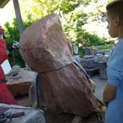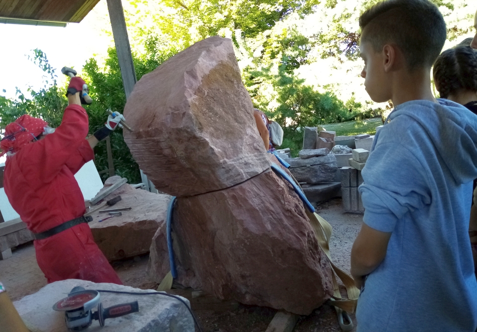 Dabei wurde deutlich, dass jeder Künstler auf seine eigene, individuelle Weise an einer Skulptur arbeitet: So werden an einer Stelle riesige Steine in verschiedenster Weise bearbeitet, mal mit Hilfe großer Maschinen, mal mit präzisen Hammerschlägen. Hier kann es laut und staubig werden, die künstlerische Arbeit ist hier auch eine große körperliche Herausforderung. In der Garage wird Porzellanmasse zu riesigen Tellern geformt, die später gestapelt werden. An anderer Stelle werden Holzleisten zu großen Objekten verschraubt und ein weiterer Künstler graviert Worte in Sandsteine aus Ettenheim, die später zu einem Kunstwerk zusammengestellt werden – in jedem Winkel des Geländes entsteht etwas, gibt es etwas zu sehen und zu bestaunen.