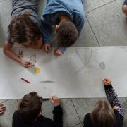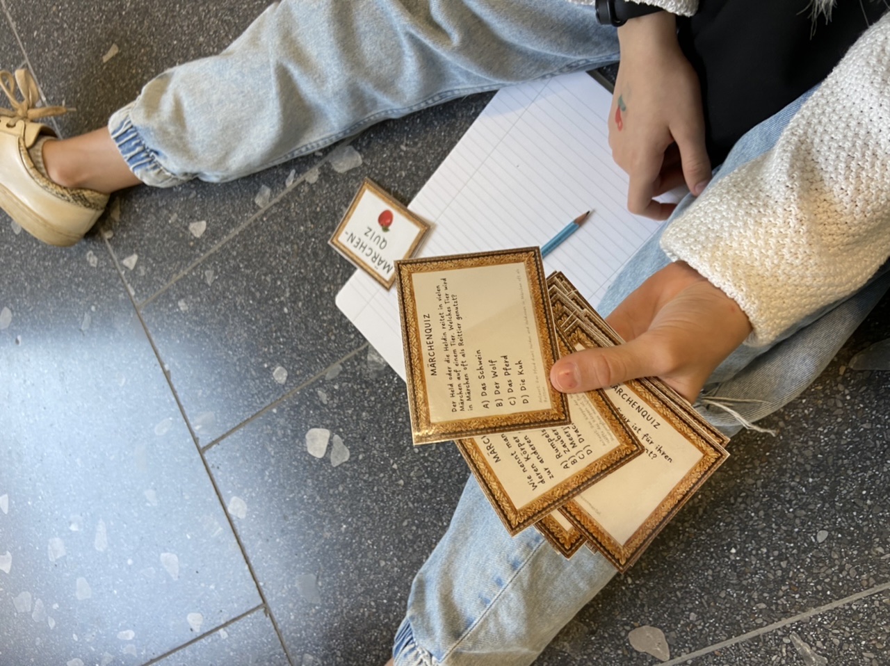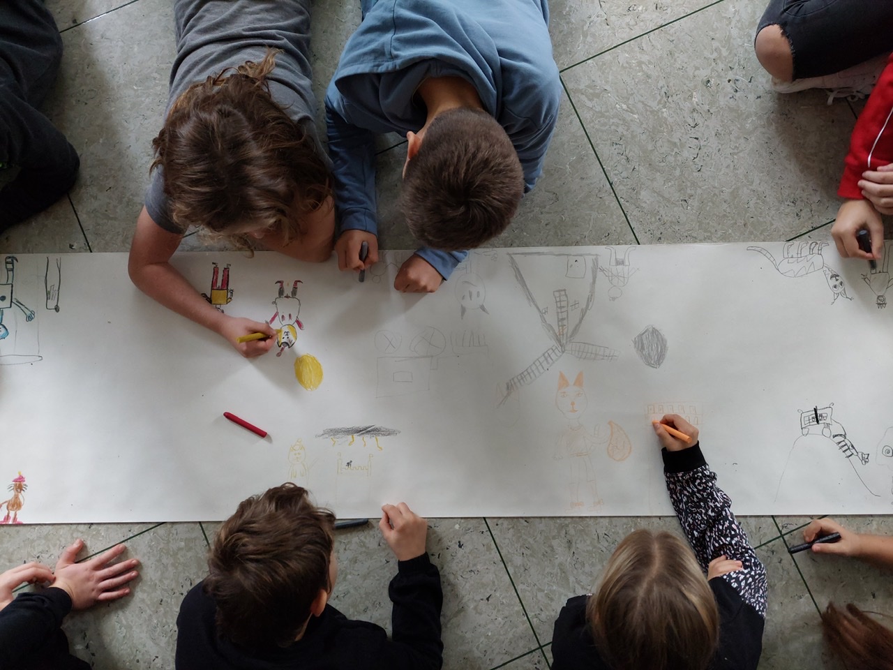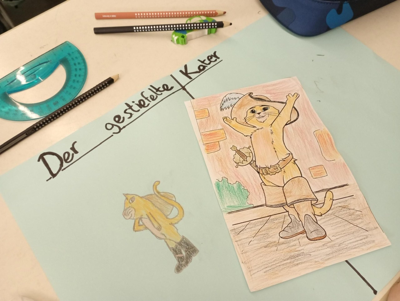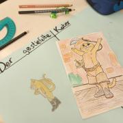 Mit kreativen Gestaltungsaufgaben, Rätseln und Spielen wurden dann im Anschluss an denen im Theaterstück gewonnenen Eindrücke weitergearbeitet. Dafür hatten sich die Deutschlehrkräfte der 5. Klassen ein besonderes Programm vorbereitet. So gestaltete eine Klasse aus dem Märchentext begeistert einen Comic zum gestiefelten Kater. Eine andere Klasse wiederum erprobte sich im Großgruppenmalen und legte eine Papierrolle im gesamten Klassenzimmer aus. Jedes Kind malte dann die jeweilige Lieblingsszene aus dem Theaterstück auf das ausgelegte Papier. Doch dabei blieb es nicht! Nach ein paar Minuten musste der Platz gewechselt werden und das begonnene Bild eines anderen Kindes weitergemalt werden. So entstand ein beeindruckendes Klassenkunstwerk zum Märchen des gestiefelten Katers.