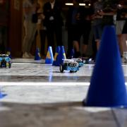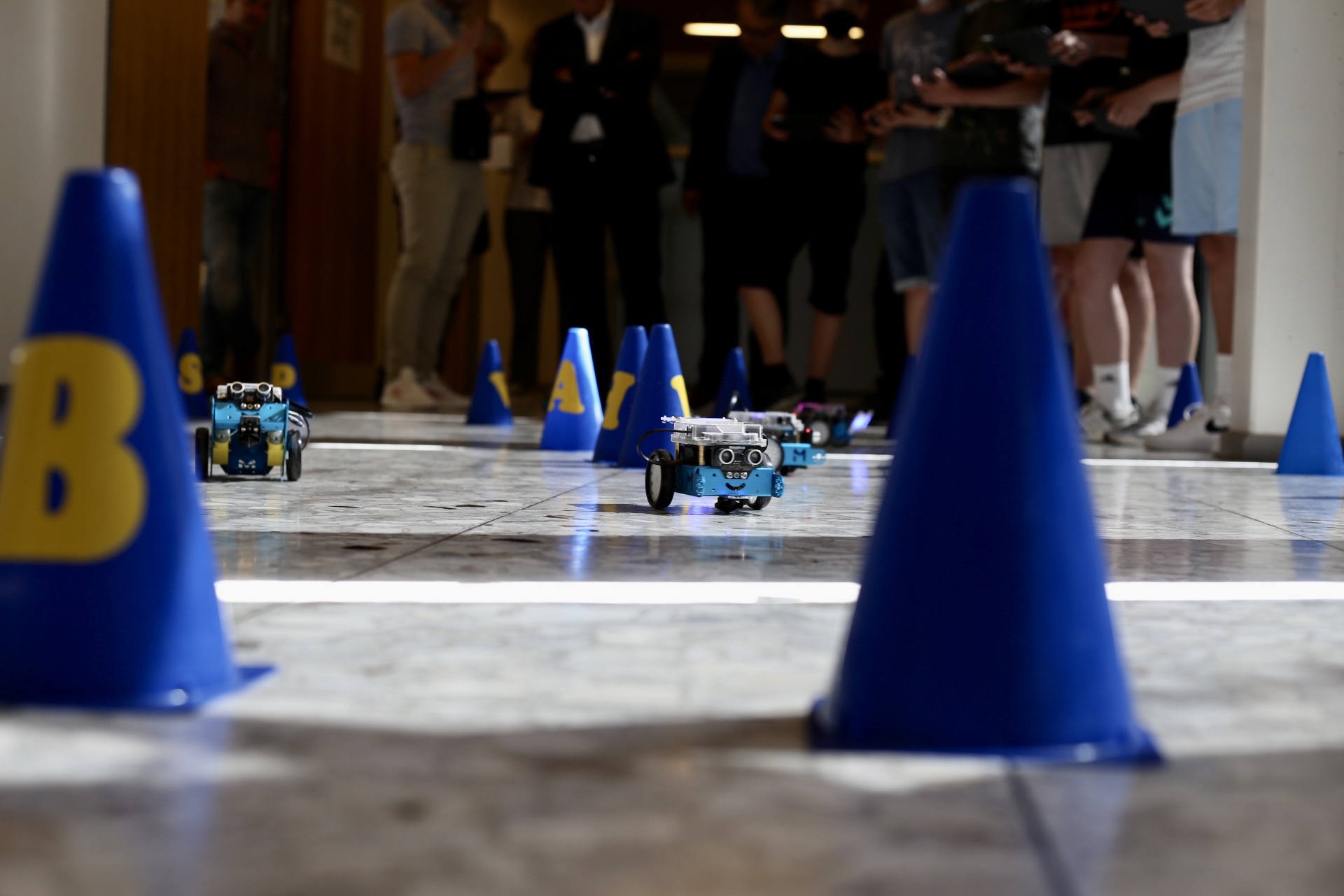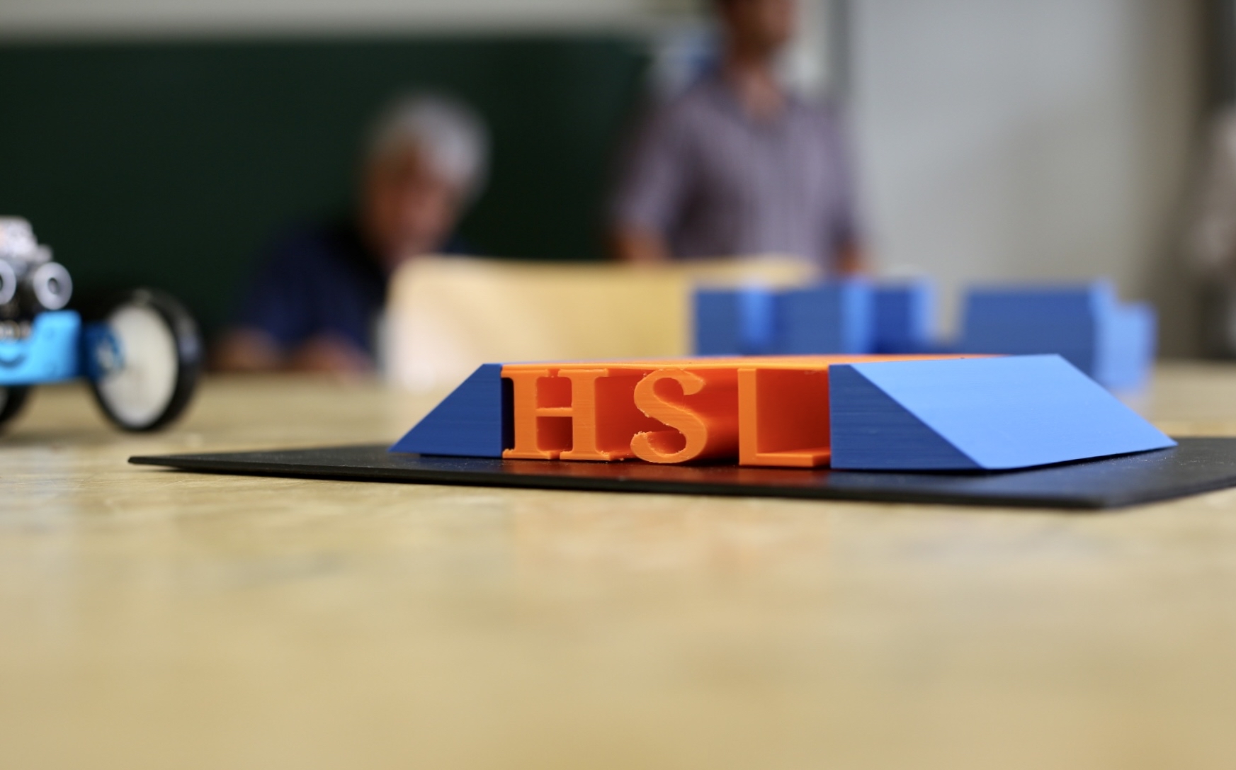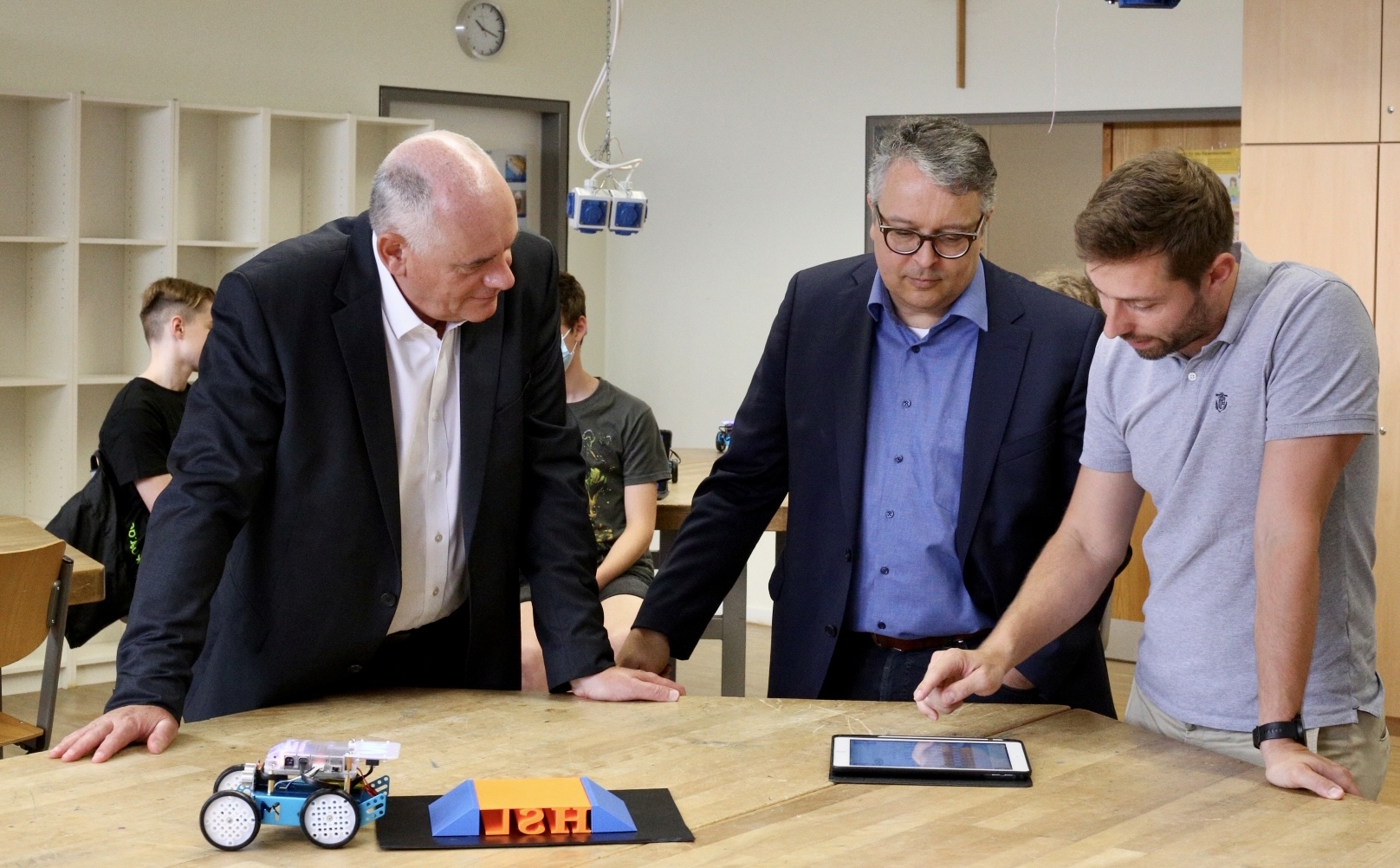 Lehrer Dominique Stolz erstellte in den 3-D-Druckern eine dreidimensionale Darstellung des Schullogos und zeigte die Anforderungen an die Nutzer hinsichtlich des hohen Zeitaufwands und der technischen Überwachung des Ausdrucks. Reinhard Kastner umriss die vielfältigen Möglichkeiten der elektronischen Steckbretter beispielsweise beim Messen des Stromverbrauchs oder in Verbindung mit USB-Ports. Hand anlegen durfte Volksbank-Vorstand Richter dann beim Steuern der fahrbaren Roboter, für die die Schülerinnen und Schüler im Schulflur einen Parcours programmiert und aufgebaut hatten.